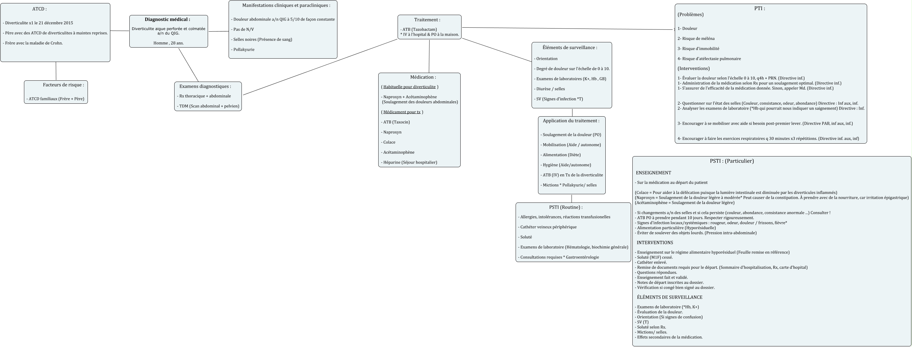 Cette carte de concepts créée avec IHMC CmapTools traite de: Sans titre 2, ATCD : - Diverticulite x1 le 21 décembre 2015 - Père avec des ATCD de diverticulites à maintes reprises. - Frère avec la maladie de Crohn. ???? Facteurs de risque : - ATCD familiaux (Frère + Père), Traitement : - ATB (Tazobactam) * IV à l'hopital & PO à la maison. ???? Éléments de surveillance : - Orientation - Degré de douleur sur l'échelle de 0 à 10. - Examens de laboratoires (K+, Hb , GB) - Diurèse / selles - SV (Signes d'infection *T), Diagnostic médical : Diverticulite aigue perforée et colmatée a/n du QIG. Homme , 28 ans. ???? Manifestations cliniques et paracliniques : - Douleur abdominale a/n QIG à 5/10 de façon constante - Pas de N/V - Selles noires (Présence de sang) - Pollakyurie, Diagnostic médical : Diverticulite aigue perforée et colmatée a/n du QIG. Homme , 28 ans. ???? ATCD : - Diverticulite x1 le 21 décembre 2015 - Père avec des ATCD de diverticulites à maintes reprises. - Frère avec la maladie de Crohn., Application du traitement : - Soulagement de la douleur (PO) - Mobilisation (Aide / autonome) - Alimentation (Diète) - Hygiène (Aide/autonome) - ATB (IV) en Tx de la diverticulite - Mictions * Pollakyurie/ selles ???? PSTI (Routine) : - Allergies, intolérances, réactions transfusionelles - Cathéter veineux périphérique - Soluté - Examens de laboratoire (Hématologie, biochimie générale) - Consultations requises * Gastroentérologie, Diagnostic médical : Diverticulite aigue perforée et colmatée a/n du QIG. Homme , 28 ans. ???? Examens diagnostiques : - Rx thoracique + abdominale - TDM (Scan abdominal + pelvien), Traitement : - ATB (Tazobactam) * IV à l'hopital & PO à la maison. ???? PTI : (Problèmes) 1- Douleur 2- Risque de méléna 3- Risque d'immobilité 4- Risque d'atélectasie pulmonaire (Interventions) 1- Évaluer la douleur selon l'échelle 0 à 10, q4h + PRN. (Directive inf.) 1- Administration de la médication selon Rx pour un soulagement optimal. (Directive inf.) 1- S'assurer de l'efficacité de la médication donnée. Sinon, appeler Md. (Directive inf.) 2- Questionner sur l'état des selles (Couleur, consistance, odeur, abondance) Directive : Inf aux, inf. 2- Analyser les examens de laboratoire (*Hb qui pourrait nous indiquer un saignement) Directive : Inf. 3- Encourager à se mobiliser avec aide si besoin post-premier lever. (Directive PAB, inf aux, inf.) 4- Encourager à faire les exercices respiratoires q 30 minutes x3 répétitions. (Directive inf. aux, inf), Traitement : - ATB (Tazobactam) * IV à l'hopital & PO à la maison. ???? Médication : ( Habituelle pour diverticulite ) - Naproxyn + Acétaminophène (Soulagement des douleurs abdominales) ( Médicament pour tx ) - ATB (Taxocin) - Naproxyn - Colace - Acétaminophène - Héparine (Séjour hospitalier), Traitement : - ATB (Tazobactam) * IV à l'hopital & PO à la maison. ???? Examens diagnostiques : - Rx thoracique + abdominale - TDM (Scan abdominal + pelvien), Éléments de surveillance : - Orientation - Degré de douleur sur l'échelle de 0 à 10. - Examens de laboratoires (K+, Hb , GB) - Diurèse / selles - SV (Signes d'infection *T) ???? Application du traitement : - Soulagement de la douleur (PO) - Mobilisation (Aide / autonome) - Alimentation (Diète) - Hygiène (Aide/autonome) - ATB (IV) en Tx de la diverticulite - Mictions * Pollakyurie/ selles