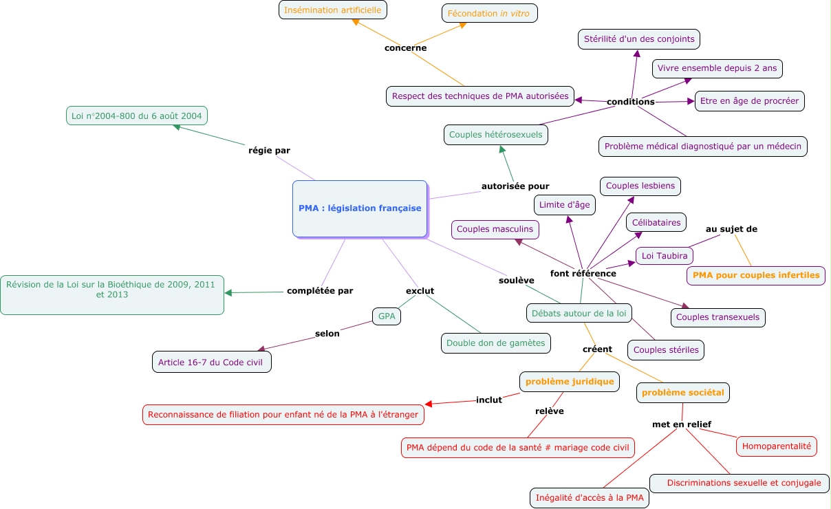 Cette carte de concepts créée avec IHMC CmapTools traite de: PMA et juridiction Version 3, Débats autour de la loi font référence Couples lesbiens, PMA : législation française exclut Double don de gamètes, Débats autour de la loi créent problème juridique, PMA : législation française régie par Loi n°2004-800 du 6 août 2004, Débats autour de la loi font référence Couples stériles, Couples hétérosexuels conditions Problème médical diagnostiqué par un médecin, Couples hétérosexuels conditions Vivre ensemble depuis 2 ans, problème sociétal met en relief Inégalité d'accès à la PMA, PMA : législation française soulève Débats autour de la loi, GPA selon Article 16-7 du Code civil, Loi Taubira au sujet de PMA pour couples infertiles, Homoparentalité met en relief Discriminations sexuelle et conjugale, problème sociétal met en relief Discriminations sexuelle et conjugale, Débats autour de la loi font référence Couples transexuels, problème juridique inclut Reconnaissance de filiation pour enfant né de la PMA à l'étranger, Débats autour de la loi font référence Couples masculins, Respect des techniques de PMA autorisées concerne Fécondation in vitro, problème juridique relève PMA dépend du code de la santé # mariage code civil, Débats autour de la loi font référence Célibataires, Couples hétérosexuels conditions Respect des techniques de PMA autorisées