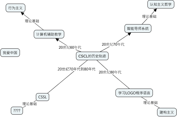 此概念图以 IHMC CmapTools 创建, 内含信息有关于: L1, CSSL 理论基础 ????, CSCL的历史轨迹 20世纪80年代 学习LOGO程序语言, CSCL的历史轨迹 20世纪60年代 计算机辅助教学, CSCL的历史轨迹 20世纪70年代 智能导师系统, 学习LOGO程序语言 理论基础 建构主义, 智能导师系统 理论基础 认知主义哲学, 计算机辅助教学 理论基础 行为主义, CSCL的历史轨迹 20世纪70年代到80年代 CSSL