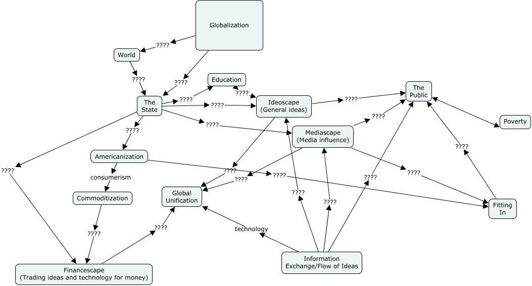 This Concept Map, created with IHMC CmapTools, has information related to: Globalization1, World ???? The State, The Public Poverty, The State ???? Financescape (Trading ideas and technology for money), Ideoscape (General ideas) ???? The Public, Financescape (Trading ideas and technology for money) ???? Global Unification, Information Exchange/Flow of Ideas ???? Mediascape (Media influence), The State ???? Mediascape (Media influence), The State ???? Americanization, Americanization ???? Fitting In, Mediascape (Media influence) ???? Global Unification, Education ???? Ideoscape (General ideas), The State ???? Education, Information Exchange/Flow of Ideas ???? The Public, Mediascape (Media influence) ???? The Public, Fitting In ???? The Public, Globalization ???? The State, Ideoscape (General ideas) ???? Global Unification, Information Exchange/Flow of Ideas ???? Ideoscape (General ideas), Mediascape (Media influence) ???? Fitting In, Globalization ???? World