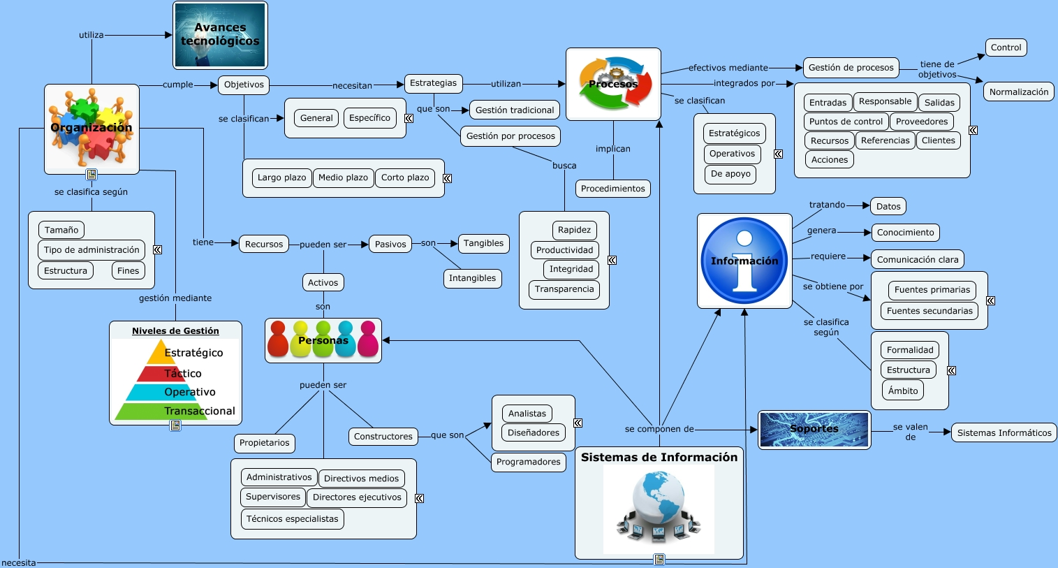 Este Cmap, tiene información relacionada con: CMAPS2, Información requiere Comunicación clara, Organización utiliza Avances tecnológicos, Información se clasifica según ????, Objetivos se clasifican ????, Sistemas de Información se componen de Información, Información tratando Datos, Estrategias que son Gestión tradicional, Información genera Conocimiento, Pasivos son Tangibles, Gestión de procesos tiene de objetivos Normalización, Procesos integrados por ????, Objetivos necesitan Estrategias, Sistemas de Información se componen de Soportes, Estrategias utilizan Procesos, Procesos implican Procedimientos, Personas pueden ser Constructores, Procesos efectivos mediante Gestión de procesos, Objetivos se clasifican ????, Constructores que son Programadores, Organización gestión mediante Niveles de Gestión