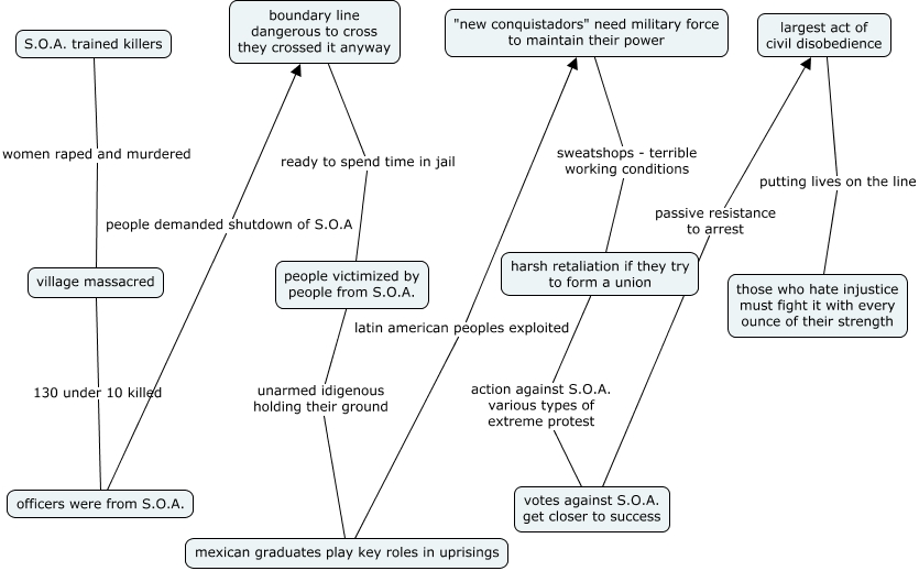 This Concept Map, created with IHMC CmapTools, has information related to: DavidBishop_GunsAndGreed, S.O.A. trained killers women raped and murdered village massacred, votes against S.O.A. get closer to success passive resistance to arrest largest act of civil disobedience, village massacred 130 under 10 killed officers were from S.O.A., people victimized by people from S.O.A. unarmed idigenous holding their ground mexican graduates play key roles in uprisings, mexican graduates play key roles in uprisings latin american peoples exploited "new conquistadors" need military force to maintain their power, harsh retaliation if they try to form a union action against S.O.A. various types of extreme protest votes against S.O.A. get closer to success, largest act of civil disobedience putting lives on the line those who hate injustice must fight it with every ounce of their strength, "new conquistadors" need military force to maintain their power sweatshops - terrible working conditions harsh retaliation if they try to form a union, officers were from S.O.A. people demanded shutdown of S.O.A boundary line dangerous to cross they crossed it anyway, boundary line dangerous to cross they crossed it anyway ready to spend time in jail people victimized by people from S.O.A.