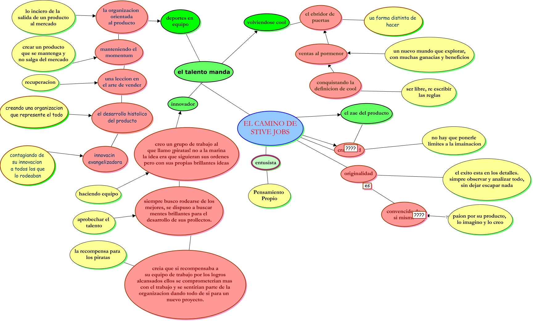 Esse mapa conceitual, produzido no IHMC CmapTools, tem a informação relacionada a: laura, lo inciero de la salida de un producto al mercado la organizacion orientada al producto, creia que si recompensaba a su equipo de trabajo por los logros alcansados ellos se comprometerian mas con el trabajo y se sentirian parte de la organizacion dando todo de si para un nuevo proyecto. siempre busco rodearse de los mejores, se dispuso a buscar mentes brillantes para el desarrollo de sus prollectos., aprobechar el talento siempre busco rodearse de los mejores, se dispuso a buscar mentes brillantes para el desarrollo de sus prollectos., un nuevo mundo que explorar, con muchas ganacias y beneficios ventas al pormenor, innovacin evangelizadora ???? el desarrollo histolico del producto, contagiando de su innovacion a todos los que lo rodeaban ???? innovacin evangelizadora, el zae del producto ???? ????, ventas al pormenor el ebridor de puertas, siempre busco rodearse de los mejores, se dispuso a buscar mentes brillantes para el desarrollo de sus prollectos. creo un grupo de trabajo al que llamo ¡piratas! no a la marina la idea era que siguieran sus ordenes pero con sus propias brillantes ideas, originalidad cratividad, deportes en equipo ???? innovador, paion por su producto, lo imagino y lo creo ???? ????, creando una organizacion que represente el todo ???? el desarrollo histolico del producto, Pensamiento Propio entusista, ua forma distinta de hacer ???? el ebridor de puertas, es ???? convencido de si mismo, conquistando la definicion de cool ventas al pormenor, EL CAMINO DE STIVE JOBS ???? el zae del producto, manteniendo el momentum la organizacion orientada al producto, entusista ???? EL CAMINO DE STIVE JOBS