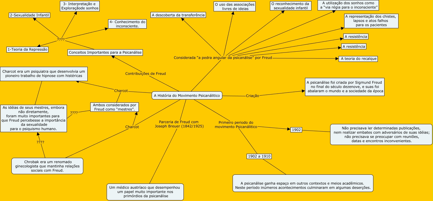 Esse mapa conceitual, produzido no IHMC CmapTools, tem a informação relacionada a: LRR-, Conceitos Importantes para a Psicanálise ???? 4- Conhecimento do inconsciente., A História do Movimento Psicanálitico Contribuições de Freud Conceitos Importantes para a Psicanálise, Charcot era um psiquiatra que desenvolvia um pioneiro trabalho de hipnose com histéricas ???? As idéias de seus mestres, embora não diretamente, foram muito importantes para que Freud percebesse a importância da sexualidade para o psiquismo humano., Conceitos Importantes para a Psicanálise ???? 1-Teoria da Repressão, A História do Movimento Psicanálitico Charcot Ambos considerados por Freud como “mestres”., 1902 ???? Não precisava ler determinadas publicações, nem realizar embates com adversários de suas idéias; não precisava se preocupar com reuniões, datas e encontros inconvenientes., A História do Movimento Psicanálitico Charcot Ambos considerados por Freud como “mestres”., A História do Movimento Psicanálitico Considerada “a pedra angular da psicanálise” por Freud O uso das associações livres de ideias, A História do Movimento Psicanálitico Considerada “a pedra angular da psicanálise” por Freud A descoberta da transferência, A História do Movimento Psicanálitico Considerada “a pedra angular da psicanálise” por Freud A teoria do recalque, A História do Movimento Psicanálitico Considerada “a pedra angular da psicanálise” por Freud A utilização dos sonhos como a “via régia para o inconsciente”, A História do Movimento Psicanálitico Charcot Charcot era um psiquiatra que desenvolvia um pioneiro trabalho de hipnose com histéricas, A História do Movimento Psicanálitico Primeiro periodo do movimento Psicanálitico 1902, Conceitos Importantes para a Psicanálise ???? 3- Interpretação e Exploraçãode sonhos, Ambos considerados por Freud como “mestres”. ???? As idéias de seus mestres, embora não diretamente, foram muito importantes para que Freud percebesse a importância da sexualidade para o psiquismo humano., A História do Movimento Psicanálitico Primeiro periodo do movimento Psicanálitico 1902 a 1910, A História do Movimento Psicanálitico Considerada “a pedra angular da psicanálise” por Freud A resistência, Conceitos Importantes para a Psicanálise ???? 2-Sexualidade Infantil, A História do Movimento Psicanálitico Considerada “a pedra angular da psicanálise” por Freud O reconhecimento da sexualidade infantil, A História do Movimento Psicanálitico Criação A psicanálise foi criada por Sigmund Freud no final do século dezenove, e suas foi abalaram o mundo e a sociedade da época