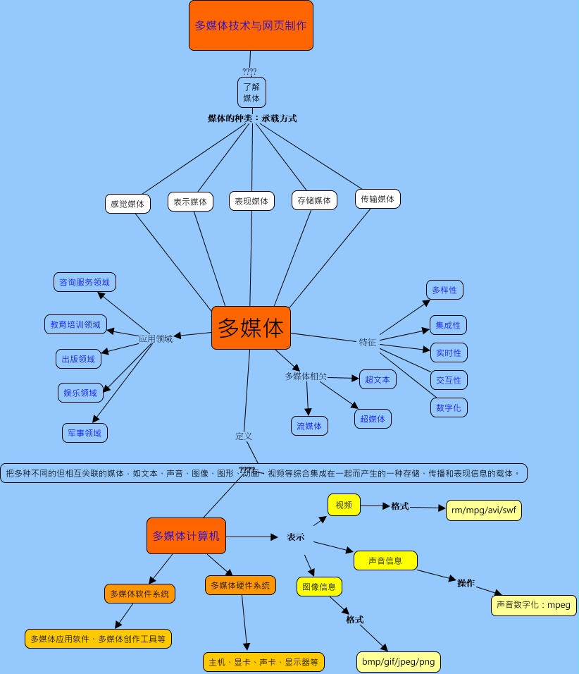 此概念图以 IHMC CmapTools 创建, 内含信息有关于: 陈蓝钰, 多媒体计算机 表示 图像信息, 表现媒体 ???? 多媒体, 了解 媒体 媒体的种类:承载方式 传输媒体, 图像信息 格式 bmp/gif/jpeg/png, 多媒体 多媒体相关 流媒体, 表示媒体 ???? 多媒体, 多媒体 应用领域 娱乐领域, 了解 媒体 媒体的种类:承载方式 存储媒体, 把多种不同的但相互关联的媒体,如文本、声音、图像、图形、动画、视频等综合集成在一起而产生的一种存储、传播和表现信息的载体。 ???? 多媒体计算机, 了解 媒体 媒体的种类:承载方式 表现媒体, 多媒体 特征 实时性, 多媒体计算机 ???? 多媒体软件系统, 多媒体 应用领域 军事领域, 多媒体 特征 多样性, 视频 格式 rm/mpg/avi/swf, 多媒体 多媒体相关 超媒体, 多媒体 特征 集成性, 多媒体计算机 表示 声音信息, 了解 媒体 媒体的种类:承载方式 感觉媒体, 多媒体 定义 把多种不同的但相互关联的媒体,如文本、声音、图像、图形、动画、视频等综合集成在一起而产生的一种存储、传播和表现信息的载体。