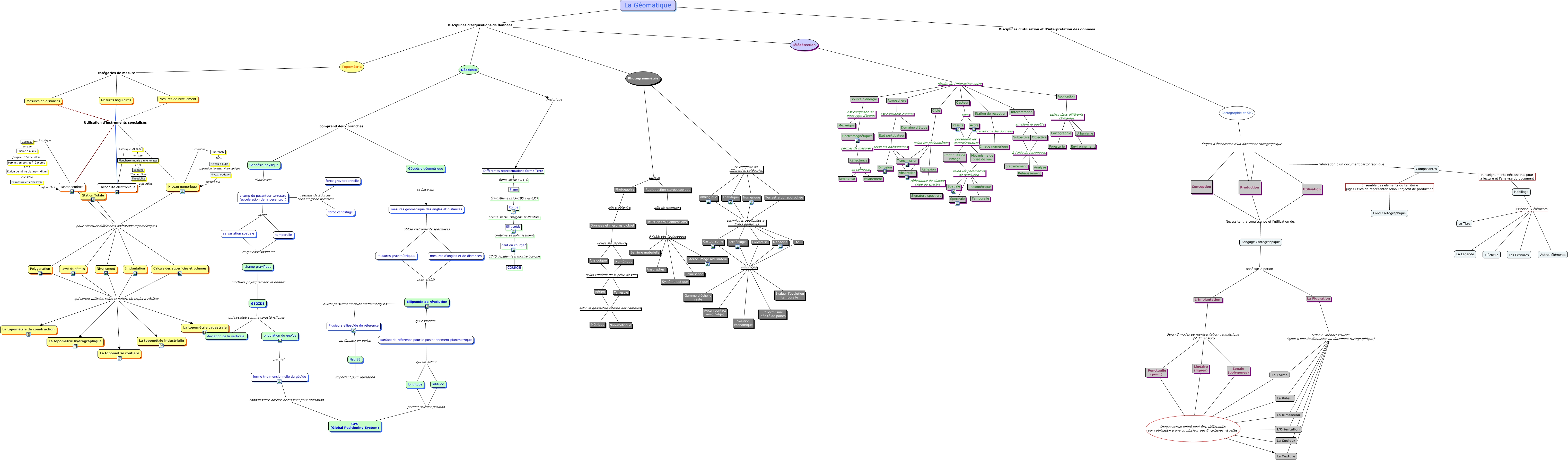 Cette carte de concepts créée avec IHMC CmapTools traite de: Géomatique, oeuf ou courge? 1740, Académie française tranche COURGE!, Implantation qui seront utilisées selon la nature du projet à réaliser La topométrie industrielle, Analogique selon l'endroit de la prise de vue Terrestre, Ellipsoïde controverse aplatissement oeuf ou courge?, Atmosphère est considéré comme État pertubateur, Analogique techniques appliquées à divers domaines Numérique, Topométrie catégories de mesure Mesures de nivellement, Station Totale pour effectuer différentes opérations topométriques Polygonation, Polygonation qui seront utilisées selon la nature du projet à réaliser La topométrie industrielle, Réflectance se compose luminance, Géodésie Historique Différentes représentations forme Terre, Nivellement qui seront utilisées selon la nature du projet à réaliser La topométrie cadastrale, L'Implantation Selon 3 modes de représentation géométrique (2 dimension) Linéaire (lignes), Théodolite aujourd'hui Théodolite électronique, Distancemètre pour effectuer différentes opérations topométriques Implantation, Station de réception transforme les données Image numérique, Zonale (polygones) Chaque classe entité peut être différentiés par l'utilisation d'une ou plusieur des 6 variables visuelles La Forme, L'Implantation Selon 3 modes de représentation géométrique (2 dimension) Ponctuelle (point), Niveau optique aujourd'hui Niveau numérique, Cible selon les phénomènes Réflexion