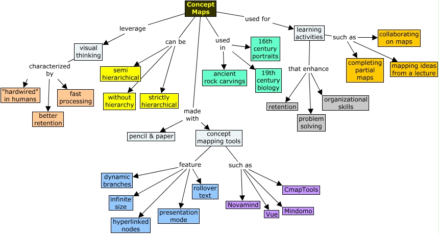 This Concept Map, created with IHMC CmapTools, has information related to: concept map activity partial map, learning activities that enhance organizational skills, learning activities that enhance retention, Concept Maps used in 19th century biology, concept mapping tools such as Vue, concept mapping tools feature rollover text, Concept Maps used in 16th century portraits, concept mapping tools feature hyperlinked nodes, concept mapping tools feature infinite size, learning activities that enhance problem solving, Concept Maps can be semi hierarichical, Concept Maps leverage visual thinking, visual thinking characterized by better retention, visual thinking characterized by "hardwired" in humans, learning activities such as collaborating on maps, Concept Maps used in ancient rock carvings, Concept Maps used for learning activities, Concept Maps made with pencil & paper, learning activities such as mapping ideas from a lecture, Concept Maps can be without hierarchy, Concept Maps can be strictly hierarchical
