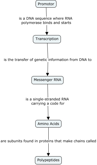 This Concept Map, created with IHMC CmapTools, has information related to: Group 2 Mini map 3, Transcription is the transfer of genetic information from DNA to Messenger RNA, Messenger RNA is a single-stranded RNA carrying a code for Amino Acids, Promotor is a DNA sequence where RNA polymerase binds and starts Transcription, Amino Acids are subunits found in proteins that make chains called Polypeptides