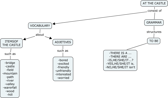 Este Cmap, tiene información relacionada con: AT THE CASTLE-Nerea, AT THE CASTLE consist of VOCABULARY, ADJETIVES such as -bored -excited -friendly -unfriendly -interested -worried, TO BE Present Simple -THERE IS A ... -THERE ARE ... -IS,HE/SHE/IT...? -YES,HE/SHE/IT is. -NO,HE/SHE/IT isn't, AT THE CASTLE consist of GRAMMAR, VOCABULARY about ITEMSOF THE CASTLE, VOCABULARY about ADJETIVES, ITEMSOF THE CASTLE such as -bridge -castle -field -mountain -path -river -valley -warerfall -wood -hill, GRAMMAR structures TO BE