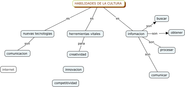 Este Cmap, tiene información relacionada con: andrea cultura, HABILIDADES DE LA CULTURA es infomacion, HABILIDADES DE LA CULTURA es herremientas vitales, infomacion son procesar, nuevas tecnologias son comunicacion, infomacion son obtener, infomacion son buscar, herremientas vitales para creatividad, infomacion son comunicar, HABILIDADES DE LA CULTURA es nuevas tecnologias