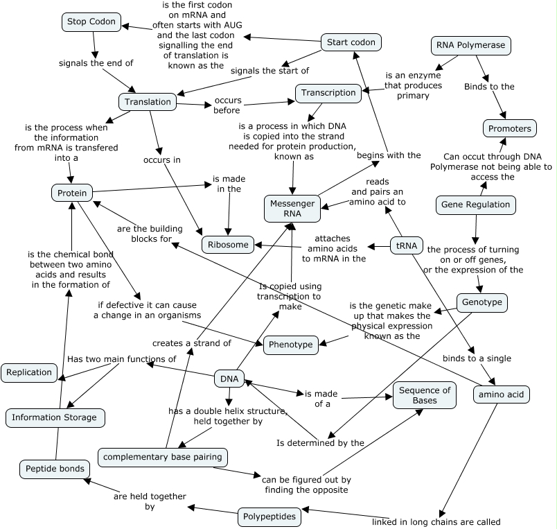 This Concept Map, created with IHMC CmapTools, has information related to: Group 5 mini map 3, RNA Polymerase is an enzyme that produces primary Transcription, Polypeptides are held together by Peptide bonds, Transcription is a process in which DNA is copied into the strand needed for protein production, known as Messenger RNA, DNA Is copied using transcription to make Messenger RNA, complementary base pairing creates a strand of Messenger RNA, Gene Regulation the process of turning on or off genes, or the expression of the Genotype, DNA has a double helix structure, held together by complementary base pairing, RNA Polymerase Binds to the Promoters, tRNA reads and pairs an amino acid to Messenger RNA, Protein is made in the Ribosome, Genotype Is determined by the DNA, DNA is made of a Sequence of Bases, Peptide bonds is the chemical bond between two amino acids and results in the formation of Protein, Translation occurs in Ribosome, DNA Has two main functions of Replication, Messenger RNA begins with the Start codon, Translation occurs before Transcription, Start codon signals the start of Translation, DNA Has two main functions of Information Storage, amino acid are the building blocks for Protein