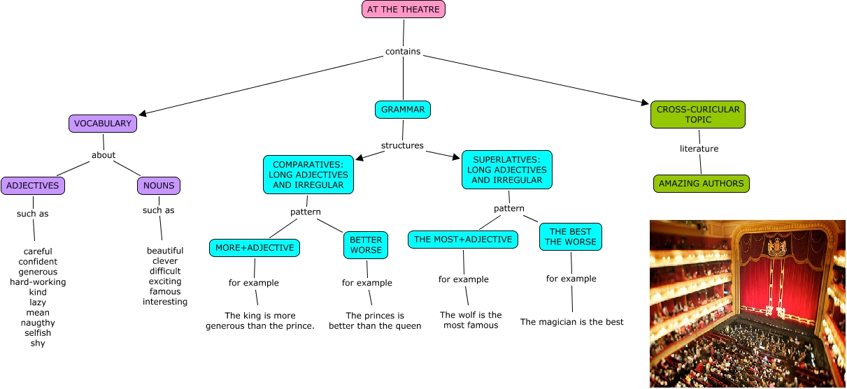 Este Cmap, tiene información relacionada con: AT THE THEATRE-Lola, MORE+ADJECTIVE for example The king is more generous than the prince., GRAMMAR structures SUPERLATIVES: LONG ADJECTIVES AND IRREGULAR, VOCABULARY about NOUNS, AT THE THEATRE contains VOCABULARY, COMPARATIVES: LONG ADJECTIVES AND IRREGULAR pattern BETTER WORSE, THE BEST THE WORSE for example The magician is the best, SUPERLATIVES: LONG ADJECTIVES AND IRREGULAR pattern THE MOST+ADJECTIVE, SUPERLATIVES: LONG ADJECTIVES AND IRREGULAR pattern THE BEST THE WORSE, CROSS-CURICULAR TOPIC literature AMAZING AUTHORS, AT THE THEATRE contains CROSS-CURICULAR TOPIC, THE MOST+ADJECTIVE for example The wolf is the most famous, COMPARATIVES: LONG ADJECTIVES AND IRREGULAR pattern MORE+ADJECTIVE, VOCABULARY about ADJECTIVES, BETTER WORSE for example The princes is better than the queen, GRAMMAR structures COMPARATIVES: LONG ADJECTIVES AND IRREGULAR, ADJECTIVES such as careful confident generous hard-working kind lazy mean naugthy selfish shy, NOUNS such as beautiful clever difficult exciting famous interesting, AT THE THEATRE contains GRAMMAR