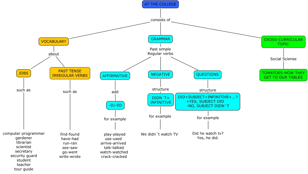 Este Cmap, tiene información relacionada con: AT THE COLLEGE-María y Lula, VOCABULARY about PAST TENSE IRREGULAR VERBS, DIDN´T+ INFINITIVE for example We didn´t watch TV, PAST TENSE IRREGULAR VERBS such as find-found have-had run-ran see-saw go-went write-wrote, GRAMMAR Past simple Regular verbs AFFIRMATIVE, NEGATIVE structure DIDN´T+ INFINITIVE, JOBS such as computer programmer gardener librarian scientist secretary security guard student teacher tour guide, AT THE COLLEGE consists of VOCABULARY, QUESTIONS structure DID+SUBJECT+INFINITIVE+...? +YES, SUBJECT DID -NO, SUBJECT DIDN´T, GRAMMAR Past simple Regular verbs QUESTIONS, AT THE COLLEGE consists of CROSS-CURRICULAR TOPIC, AFFIRMATIVE add -D/-ED, AT THE COLLEGE consists of GRAMMAR, -D/-ED for example play-played use-used arrive-arrived talk-talked watch-watched crack-cracked, GRAMMAR Past simple Regular verbs NEGATIVE, VOCABULARY about JOBS, DID+SUBJECT+INFINITIVE+...? +YES, SUBJECT DID -NO, SUBJECT DIDN´T for example Did he watch tv? Yes, he did., CROSS-CURRICULAR TOPIC Social Sciense TOMATOES:HOW THEY GET TO OUR TABLES