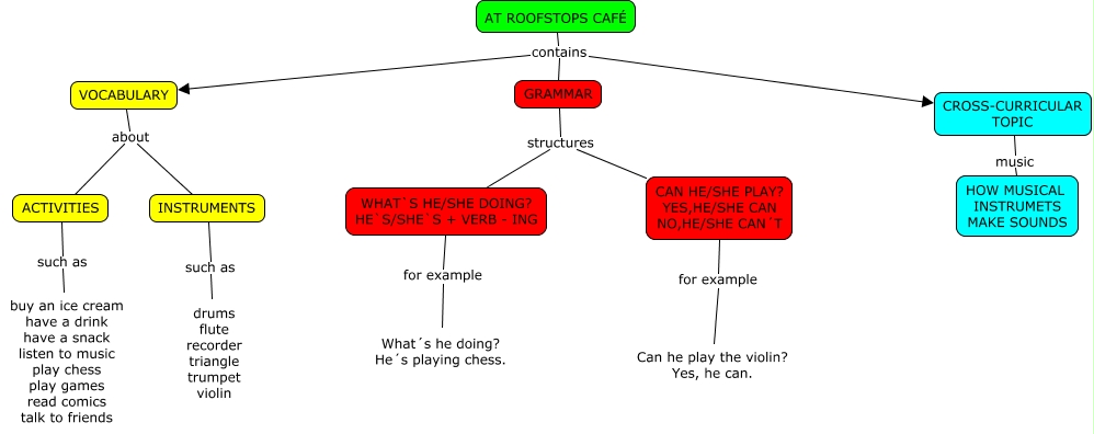 Este Cmap, tiene información relacionada con: AT ROOFSTOPS CAFÉ-Alberto y Samuel, GRAMMAR structures CAN HE/SHE PLAY? YES,HE/SHE CAN NO,HE/SHE CAN´T, GRAMMAR structures WHAT`S HE/SHE DOING? HE`S/SHE`S + VERB - ING, CROSS-CURRICULAR TOPIC music HOW MUSICAL INSTRUMETS MAKE SOUNDS, CAN HE/SHE PLAY? YES,HE/SHE CAN NO,HE/SHE CAN´T for example Can he play the violin? Yes, he can., INSTRUMENTS such as drums flute recorder triangle trumpet violin, AT ROOFSTOPS CAFÉ contains VOCABULARY, WHAT`S HE/SHE DOING? HE`S/SHE`S + VERB - ING for example What´s he doing? He´s playing chess., AT ROOFSTOPS CAFÉ contains GRAMMAR, VOCABULARY about ACTIVITIES, ACTIVITIES such as buy an ice cream have a drink have a snack listen to music play chess play games read comics talk to friends, AT ROOFSTOPS CAFÉ contains CROSS-CURRICULAR TOPIC, VOCABULARY about INSTRUMENTS