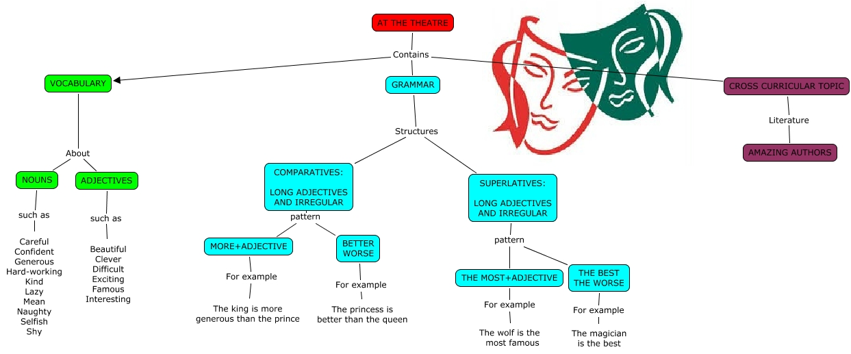 Este Cmap, tiene información relacionada con: AT THE THEARTE-Joaquín, VOCABULARY About ADJECTIVES, BETTER WORSE For example The princess is better than the queen, CROSS CURRICULAR TOPIC Literature AMAZING AUTHORS, AT THE THEATRE Contains CROSS CURRICULAR TOPIC, SUPERLATIVES: LONG ADJECTIVES AND IRREGULAR pattern THE MOST+ADJECTIVE, VOCABULARY About NOUNS, COMPARATIVES: LONG ADJECTIVES AND IRREGULAR pattern BETTER WORSE, AT THE THEATRE Contains VOCABULARY, THE MOST+ADJECTIVE For example The wolf is the most famous, SUPERLATIVES: LONG ADJECTIVES AND IRREGULAR pattern THE BEST THE WORSE, ADJECTIVES such as Beautiful Clever Difficult Exciting Famous Interesting, AT THE THEATRE Contains GRAMMAR, COMPARATIVES: LONG ADJECTIVES AND IRREGULAR pattern MORE+ADJECTIVE, GRAMMAR Structures SUPERLATIVES: LONG ADJECTIVES AND IRREGULAR, MORE+ADJECTIVE For example The king is more generous than the prince, GRAMMAR Structures COMPARATIVES: LONG ADJECTIVES AND IRREGULAR, THE BEST THE WORSE For example The magician is the best, NOUNS such as Careful Confident Generous Hard-working Kind Lazy Mean Naughty Selfish Shy