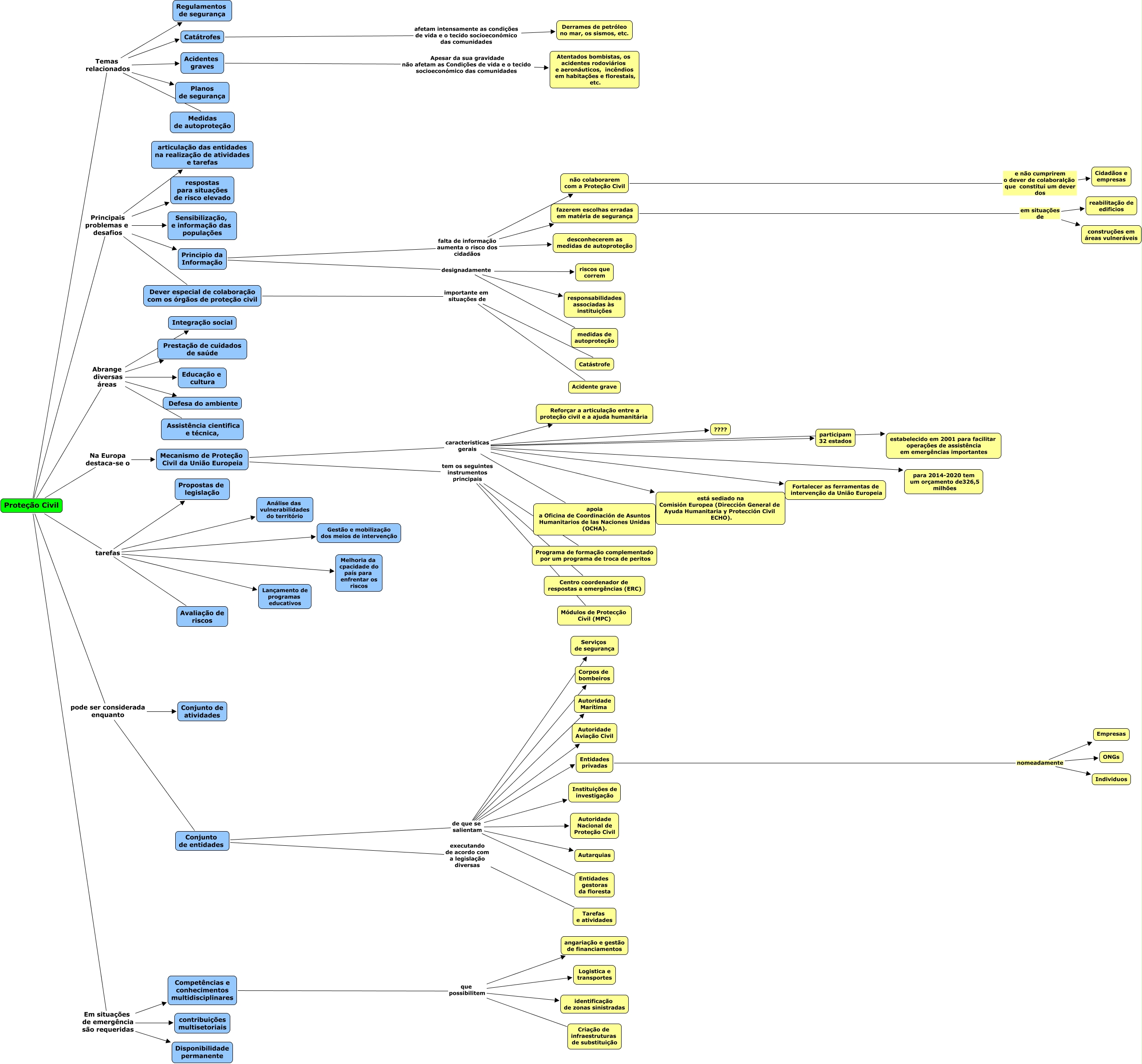 Esse mapa conceitual, produzido no IHMC CmapTools, tem a informação relacionada a: prot_civil_1, Proteção Civil Abrange diversas áreas Integração social, Competências e conhecimentos multidisciplinares que possibilitem Criação de infraestruturas de substituição, Proteção Civil Em situações de emergência são requeridas Competências e conhecimentos multidisciplinares, fazerem escolhas erradas em matéria de segurança em situações de construções em áreas vulneráveis, Conjunto de entidades de que se salientam Autoridade Aviação Civil, Proteção Civil Principais problemas e desafios articulação das entidades na realização de atividades e tarefas, Principio da Informação falta de informação aumenta o risco dos cidadãos desconhecerem as medidas de autoproteção, Proteção Civil tarefas Análise das vulnerabilidades do território, Proteção Civil pode ser considerada enquanto Conjunto de atividades, Mecanismo de Proteção Civil da União Europeia tem os seguintes instrumentos principais Centro coordenador de respostas a emergências (ERC), Mecanismo de Proteção Civil da União Europeia tem os seguintes instrumentos principais Módulos de Protecção Civil (MPC), Proteção Civil Principais problemas e desafios Principio da Informação, Conjunto de entidades de que se salientam Autoridade Marítima, Dever especial de colaboração com os órgãos de proteção civil importante em situações de Acidente grave, Conjunto de entidades de que se salientam Entidades gestoras da floresta, Proteção Civil pode ser considerada enquanto Conjunto de entidades, Mecanismo de Proteção Civil da União Europeia tem os seguintes instrumentos principais Programa de formação complementado por um programa de troca de peritos, Principio da Informação designadamente responsabilidades associadas às instituições, Competências e conhecimentos multidisciplinares que possibilitem Logistica e transportes, Competências e conhecimentos multidisciplinares que possibilitem identificação de zonas sinistradas