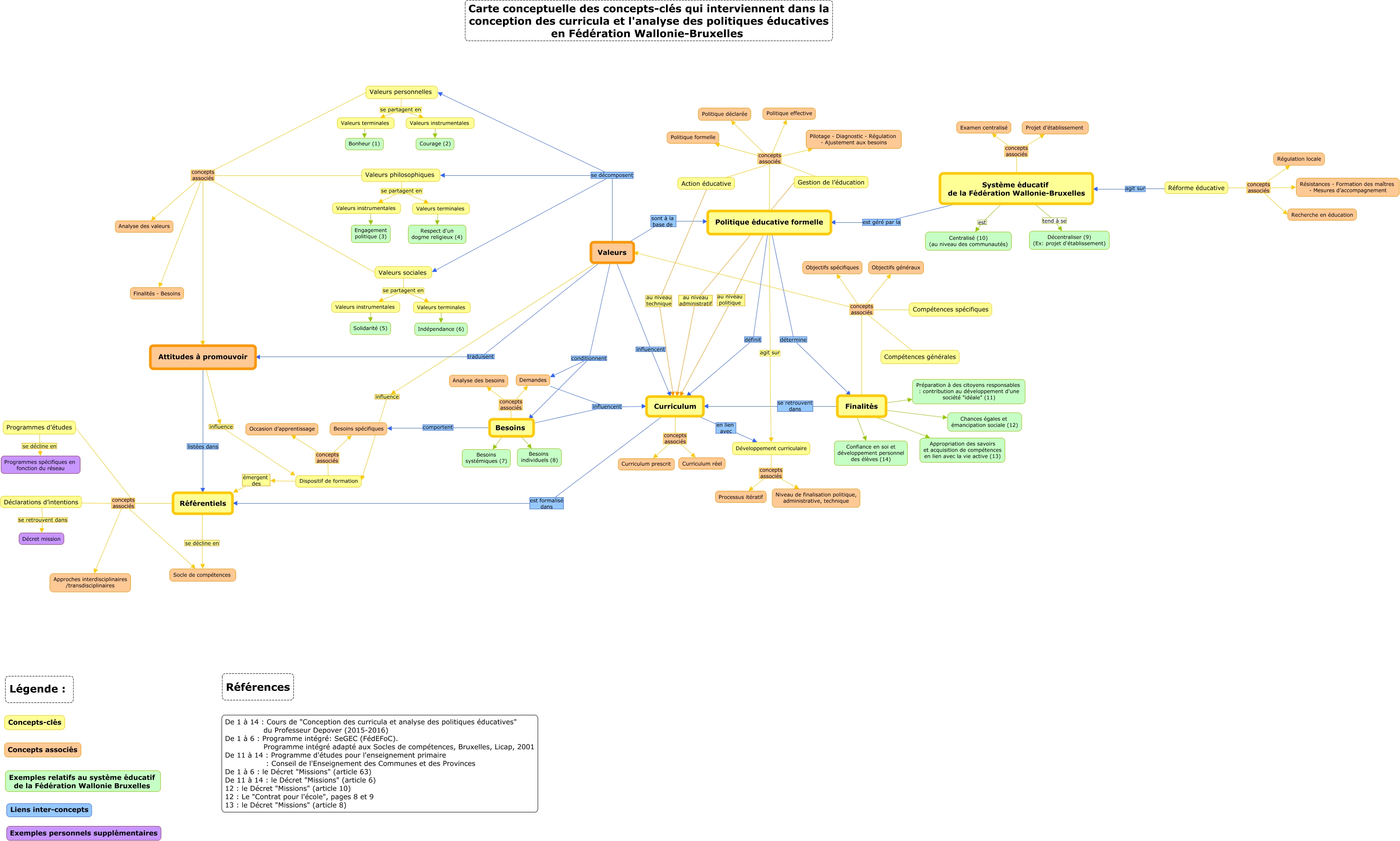 Cette carte de concepts créée avec IHMC CmapTools traite de: Curricula, Compétences spécifiques concepts associés Valeurs, Valeurs terminales ???? Bonheur (1), Réforme éducative concepts associés Recherche en éducation, Finalités Chances égales et émancipation sociale (12), Besoins comportent Besoins spécifiques, Politique éducative formelle concepts associés Politique formelle, Attitudes à promouvoir influence Dispositif de formation, Finalités Préparation à des citoyens responsables : contribution au développement d'une société "idéale" (11), Finalités Appropriation des savoirs et acquisition de compétences en lien avec la vie active (13), Gestion de l’éducation concepts associés Politique formelle, Valeurs philosophiques concepts associés Attitudes à promouvoir, Réforme éducative concepts associés Résistances - Formation des maîtres - Mesures d’accompagnement, Valeurs philosophiques se partagent en Valeurs instrumentales, Valeurs sociales se partagent en Valeurs instrumentales, Programmes d’études concepts associés Approches interdisciplinaires /transdisciplinaires, Politique éducative formelle au niveau politique Curriculum, Dispositif de formation émergent des Référentiels, Développement curriculaire concepts associés Niveau de finalisation politique, administrative, technique, Action éducative au niveau technique Curriculum, Valeurs personnelles se partagent en Valeurs instrumentales