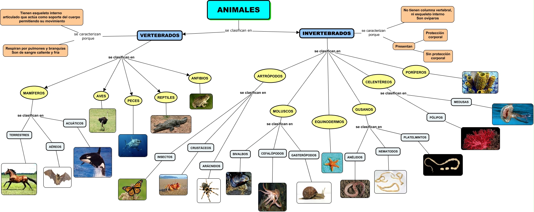 Este Cmap, tiene información relacionada con: ANIMALES VERTEBRADOS E INVERTEBRADOS, ARTRÓPODOS se clasifican en INSECTOS, VERTEBRADOS se caracterizan porque Tienen esqueleto interno articulado que actúa como soporte del cuerpo permitiendo su movimiento, REPTILES ????, ANFIBIOS ????, CEFALÓPODOS ????, INVERTEBRADOS se clasifican en GUSANOS, GUSANOS se clasifican en NEMATODOS, MOLUSCOS se clasifican en GASTERÓPODOS, INVERTEBRADOS se caracterizan porque Presentan, VERTEBRADOS se clasifican en REPTILES, CELENTÉREOS se clasifican en PÓLIPOS, PLATELMINTOS ????, Presentan ???? Protección corporal, INVERTEBRADOS se clasifican en PORÍFEROS, AVES ???? ????, AÉREOS ????, INVERTEBRADOS se clasifican en MOLUSCOS, VERTEBRADOS se clasifican en PECES, VERTEBRADOS se clasifican en ANFIBIOS, MOLUSCOS se clasifican en CEFALÓPODOS