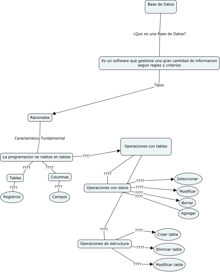 Este Cmap, tiene información relacionada con: leonelacosta1, Base de Datos ¿Que es una Base de Datos? Es un software que gestiona una gran cantidad de informacion segun reglas y criterios, Operaciones con datos ???? Modificar, Operaciones con tablas ???? Operaciones con datos, Operaciones con datos ???? Seleccionar, Columnas ???? Campos, Operaciones con tablas ???? Operaciones de estructura, Operaciones de estructura ???? Eliminar tabla, Es un software que gestiona una gran cantidad de informacion segun reglas y criterios Tipos Racionales, La programacion se realiza en tablas ???? Columnas, Operaciones con datos ???? Borrar, Tablas ???? Registros, Operaciones de estructura ???? Crear tabla, La programacion se realiza en tablas ???? Operaciones con tablas, Racionales Caracteristica Fundamental La programacion se realiza en tablas, Operaciones de estructura ???? Modificar tabla, Operaciones con datos ???? Agregar, La programacion se realiza en tablas ???? Tablas