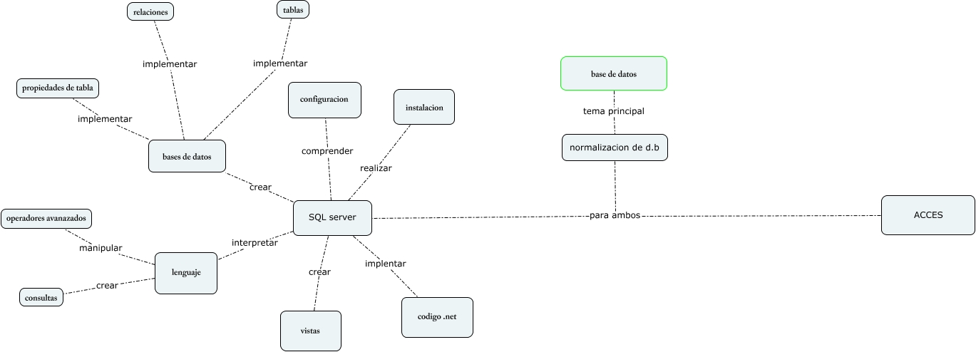 Este Cmap, tiene información relacionada con: base de datos, lenguaje manipular operadores avanazados, bases de datos implementar relaciones, SQL server interpretar lenguaje, SQL server implentar codigo .net, normalizacion de d.b para ambos ACCES, SQL server comprender configuracion, SQL server realizar instalacion, SQL server crear vistas, lenguaje crear consultas, base de datos tema principal normalizacion de d.b, bases de datos implementar tablas, normalizacion de d.b para ambos SQL server, SQL server crear bases de datos, bases de datos implementar propiedades de tabla