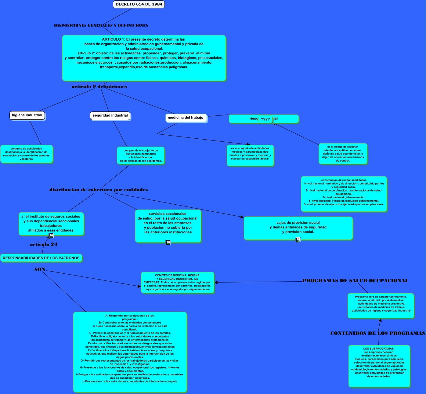 Este Cmap, tiene información relacionada con: DECRETO 614 DE 1984, es el riesgo de caracter latente, suceptible de causar daño ala salud cuando fallan o dejan de operarlos mecanismos de control. ???? ????, ARTICULO 1: El presente decreto determina las bases de organizacion y administracion gubernamental y privada de la salud ocupacional. articulo 2: objeto; de las actividades propender, proteger, prevenir, eliminar y controlar. proteger contra los riesgos como: fisicos, quimicos, biologicos, psicosociales, mecanicos,electricos, causados por radiaciones,produccion, almacenamiento, transporte,expendio,uso de sustancias peligrosas. articulo 9 definiciones seguridad industrial, higiene industrial conjunto de actividades destinadas a la identificacion de evaluacion y control de los agentes y factores., medicina del trabajo es el conjunto de actividades medicas y paramedicas des- tinadas a promover y mejorar, y evaluar su capacidad laboral., medicina del trabajo riesgo potencial, comprende el conjunto de actividades destinadas a la identificacion de las causas de los accidentes. distribucion de cobertura por entidades cajas de prevision social y demas entidades de suguridad y prevision social., comprende el conjunto de actividades destinadas a la identificacion de las causas de los accidentes. distribucion de cobertura por entidades servicios seccionales de salud, por la salud ocupacional en el resto de las empresas y poblacion no cubierta por las anteriores instituciones., Programa sera de caracter permanente. estarà constituido por 4 elementos: - actividades de medicina preventiva. - actividades de medicina de trabajo. - actividades de higiene y seguridad industrial. PROGRAMAS DE SALUD OCUPACIONAL COMITES DE MEDICINA, HIGIENE Y SEGURIDAD INDUSTRIAL DE EMPRESAS: Todas las empresas estan regidas por el comite, representado por patronos, trabajadores cuya organizacion se registra por reglamentacion., seguridad industrial ???? comprende el conjunto de actividades destinadas a la identificacion de las causas de los accidentes., A- Responder por la ejecucion de los programas . B- Comprobar ante las entidades competenctes si fuese nesesario sobre la norma de protccion si se esta cumpliendo. C- Permitir la constitucion y el funcionamiento de los comites. D-Notificar obligatoriamente a las autoridades competentes los accidentes de trabajo y las enfermedades profecionales. E- Informar a l0os trabajadores sobre los riesgos alos que estan sometidos. sus efectos y sus medidaspreventivas correspondientes. F- Facilitar a los trabajadores la asistencia a cursos y progranas educativos que realicen las autoridades para la intervencion de los riegos profesionales. G- Permitir que representantes de los trabajadores participen en las vicitas de inspeccion y investigacion. H- Presentar a los funcionarios de salud ocupacional los registros, informes, actas y documentos. I- Entrgar a las entidades competentes para su analisis de sustancias y materiales que se consideren peligrosos. J- Proporcionar a las autoridades competentes de informacion completa. SON COMITES DE MEDICINA, HIGIENE Y SEGURIDAD INDUSTRIAL DE EMPRESAS: Todas las empresas estan regidas por el comite, representado por patronos, trabajadores cuya organizacion se registra por reglamentacion., ARTICULO 1: El presente decreto determina las bases de organizacion y administracion gubernamental y privada de la salud ocupacional. articulo 2: objeto; de las actividades propender, proteger, prevenir, eliminar y controlar. proteger contra los riesgos como: fisicos, quimicos, biologicos, psicosociales, mecanicos,electricos, causados por radiaciones,produccion, almacenamiento, transporte,expendio,uso de sustancias peligrosas. articulo 9 definiciones medicina del trabajo, comprende el conjunto de actividades destinadas a la identificacion de las causas de los accidentes. distribucion de cobertura por entidades a: el instituto de seguros sociales y sus dependencial seccionales trabajadores afiliados a esas entidades., LOS SUBPROGRAMAS : las empresas deberan: -realizar examenes clinicos medicos, paraclinicos para admision, seleccion de personal segun aptitudes. - desarrollar avtividades de vigilancia epidemiologicaenfermedades y patologias. - desarrollar actividades de prevencion de enfermedades. CONTENIDOS DE LOS PROGRAMAS Programa sera de caracter permanente. estarà constituido por 4 elementos: - actividades de medicina preventiva. - actividades de medicina de trabajo. - actividades de higiene y seguridad industrial., ARTICULO 1: El presente decreto determina las bases de organizacion y administracion gubernamental y privada de la salud ocupacional. articulo 2: objeto; de las actividades propender, proteger, prevenir, eliminar y controlar. proteger contra los riesgos como: fisicos, quimicos, biologicos, psicosociales, mecanicos,electricos, causados por radiaciones,produccion, almacenamiento, transporte,expendio,uso de sustancias peligrosas. articulo 9 definiciones higiene industrial, seguridad industrial ???? comprende el conjunto de actividades destinadas a la identificacion de las causas de los accidentes., DECRETO 614 DE 1984 DISPOSICIONES GENERALES Y DEFINICIONES ARTICULO 1: El presente decreto determina las bases de organizacion y administracion gubernamental y privada de la salud ocupacional. articulo 2: objeto; de las actividades propender, proteger, prevenir, eliminar y controlar. proteger contra los riesgos como: fisicos, quimicos, biologicos, psicosociales, mecanicos,electricos, causados por radiaciones,produccion, almacenamiento, transporte,expendio,uso de sustancias peligrosas., RESPONSABILIDADES DE LOS PATRONOS articulo 24 a: el instituto de seguros sociales y sus dependencial seccionales trabajadores afiliados a esas entidades.