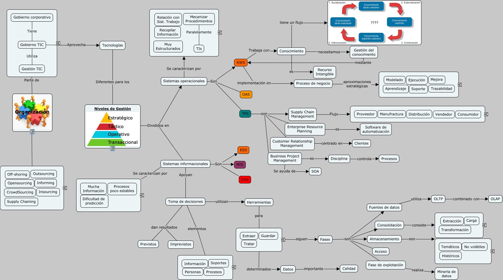 Este Cmap, tiene información relacionada con: Tema2, Sistemas operacionales Son OAS, Herramientas para ????, ???? Parte de Organización, Fases son Consolidación, Sistemas operacionales Se caracterizan por ????, Almacenamiento son ????, ???? siguen Fases, Fases son Acceso, Sistemas informacionales Se caracterizan por ????, Fases son Almacenamiento, Conocimiento tiene un flujo ????, KWS Trabaja con Conocimiento, TPS son Supply Chain Management, Conocimiento necesitamos Gestión del conocimiento, Toma de decisiones dan resultados Imprevistos, OLTP combinado con OLAP, Sistemas operacionales Son TPS, Gestión del conocimiento mediante KWS, Sistemas informacionales Son DSS, Fuentes de datos utiliza OLTP
