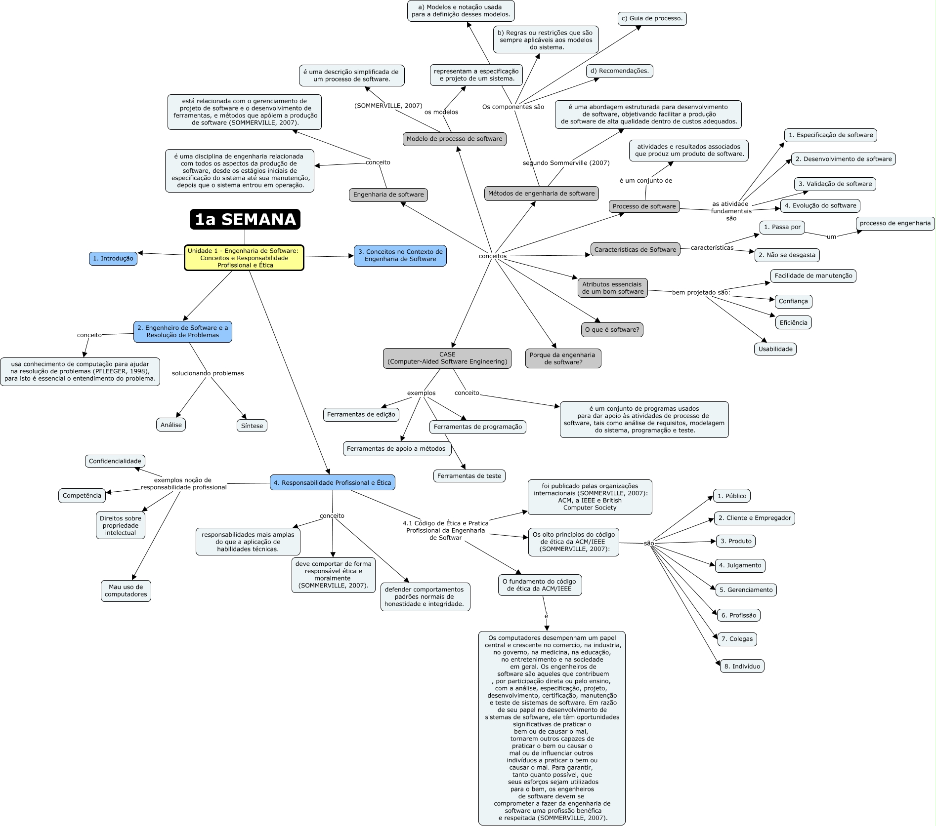 Esse mapa conceitual, produzido no IHMC CmapTools, tem a informação relacionada a: 1a semana, 4. Responsabilidade Profissional e Ética exemplos noção de responsabilidade profissional Competência, 3. Conceitos no Contexto de Engenharia de Software conceitos Modelo de processo de software, Atributos essenciais de um bom software bem projetado são: Confiança, Atributos essenciais de um bom software bem projetado são: Eficiência, 2. Engenheiro de Software e a Resolução de Problemas conceito usa conhecimento de computação para ajudar na resolução de problemas (PFLEEGER, 1998), para isto é essencial o entendimento do problema., Métodos de engenharia de software Os componentes são b) Regras ou restrições que são sempre aplicáveis aos modelos do sistema., Os oito princípios do código de ética da ACM/IEEE (SOMMERVILLE, 2007): são 5. Gerenciamento, 3. Conceitos no Contexto de Engenharia de Software conceitos Métodos de engenharia de software, Atributos essenciais de um bom software bem projetado são: Facilidade de manutenção, CASE (Computer-Aided Software Engineering) exemplos Ferramentas de teste, 4. Responsabilidade Profissional e Ética exemplos noção de responsabilidade profissional Mau uso de computadores, 1a SEMANA Unidade 1 - Engenharia de Software: Conceitos e Responsabilidade Profissional e Ética 4. Responsabilidade Profissional e Ética, CASE (Computer-Aided Software Engineering) exemplos Ferramentas de edição, 3. Conceitos no Contexto de Engenharia de Software conceitos CASE (Computer-Aided Software Engineering), 1a SEMANA Unidade 1 - Engenharia de Software: Conceitos e Responsabilidade Profissional e Ética 2. Engenheiro de Software e a Resolução de Problemas, CASE (Computer-Aided Software Engineering) exemplos Ferramentas de apoio a métodos, 3. Conceitos no Contexto de Engenharia de Software conceitos Engenharia de software, 1a SEMANA Unidade 1 - Engenharia de Software: Conceitos e Responsabilidade Profissional e Ética 3. Conceitos no Contexto de Engenharia de Software, Processo de software as atividade fundamentais são 4. Evolução do software, Processo de software as atividade fundamentais são 1. Especificação de software