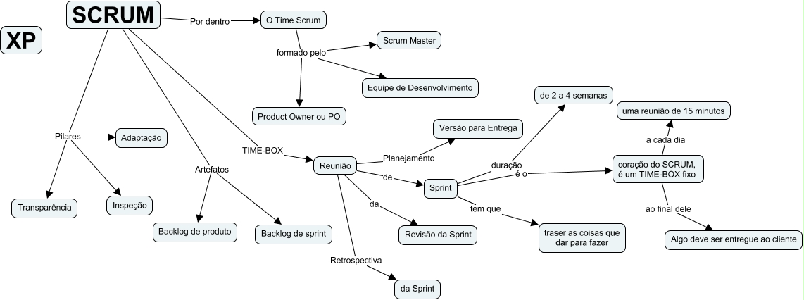 Esse mapa conceitual, produzido no IHMC CmapTools, tem a informação relacionada a: xp e scrum, coração do SCRUM, é um TIME-BOX fixo a cada dia uma reunião de 15 minutos, Reunião Planejamento Versão para Entrega, O Time Scrum formado pelo Product Owner ou PO, SCRUM Por dentro O Time Scrum, SCRUM TIME-BOX Reunião, O Time Scrum formado pelo Scrum Master, Sprint duração de 2 a 4 semanas, SCRUM Pilares Transparência, SCRUM Pilares Adaptação, SCRUM Artefatos Backlog de produto, coração do SCRUM, é um TIME-BOX fixo ao final dele Algo deve ser entregue ao cliente, SCRUM Artefatos Backlog de sprint, Reunião Retrospectiva da Sprint, O Time Scrum formado pelo Equipe de Desenvolvimento, Reunião da Revisão da Sprint, Sprint é o coração do SCRUM, é um TIME-BOX fixo, SCRUM Pilares Inspeção, Sprint tem que traser as coisas que dar para fazer, Reunião de Sprint