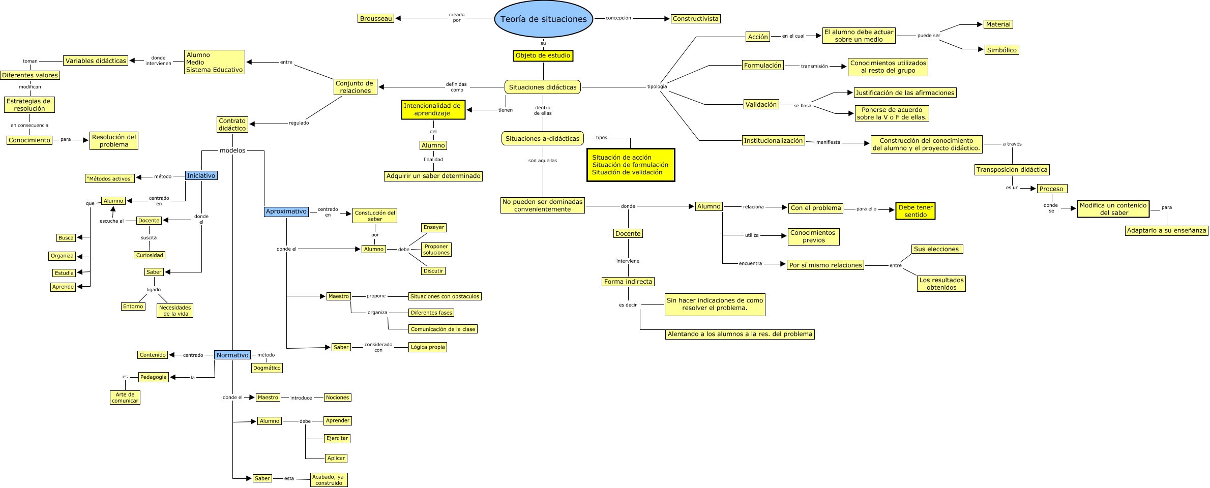 Este Cmap, tiene información relacionada con: teoria de situaciones, Iniciativo centrado en Alumno, Alumno que Aprende, Por sí mismo relaciones entre Sus elecciones, Teoría de situaciones concepción Constructivista, El alumno debe actuar sobre un medio puede ser Simbólico, Alumno debe Discutir, Forma indirecta es decir Alentando a los alumnos a la res. del problema, Acción en el cual El alumno debe actuar sobre un medio, <math xmlns="http://www.w3.org/1998/Math/MathML"> <mtext> Alumno