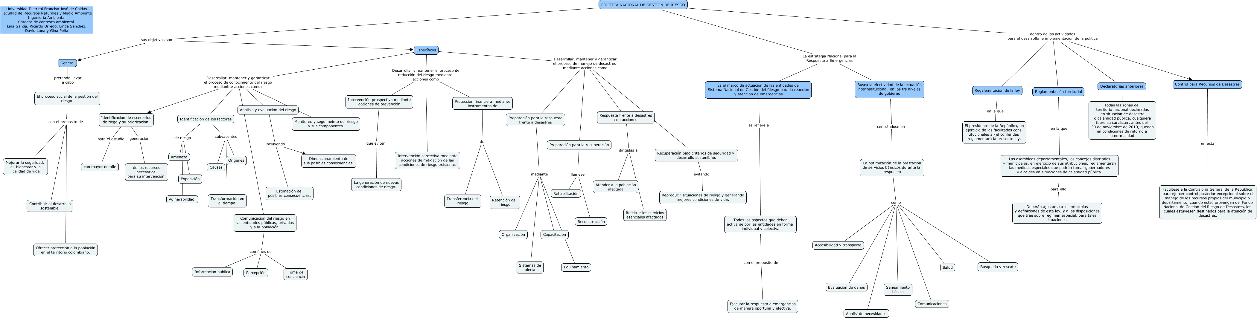 Esse mapa conceitual, produzido no IHMC CmapTools, tem a informação relacionada a: Política riesgo, Protección financiera mediante instrumentos de de Transferencia del riesgo, POLÍTICA NACIONAL DE GESTIÓN DE RIESGO sus objetivos son General, Control para Recursos de Desastres en esta Facúltese a la Contraloría General de la República, para ejercer control posterior excepcional sobre el manejo de los recursos propios del municipio o departamento, cuando estso provengan del Fondo Nacional de Gestión del Riesgo de Desastres, los cuales estuviesen destinados para la atención de desastres., Análisis y evaluación del riesgo incluyendo Estimación de posibles consecuencias., POLÍTICA NACIONAL DE GESTIÓN DE RIESGO dentro de las actividades para el desarrollo e implementación de la política Control para Recursos de Desastres, La optimización de la prestación de servicios b{asicos durante la respuesta como Salud, La optimización de la prestación de servicios b{asicos durante la respuesta como Comunicaciones, La optimización de la prestación de servicios b{asicos durante la respuesta como Saneamiento básico, La optimización de la prestación de servicios b{asicos durante la respuesta como Evaluación de daños, Intervención prospectiva mediante acciones de prevención que eviten La generación de nuevas condiciones de riesgo., Específicos Desarrollar y mantener el proceso de reducción del riesgo mediante acciones como Intervención correctiva mediante acciones de mitigación de las condiciones de riesgo existente., Preparación para la respuesta frente a desastres mediante Sistemas de alerta, Respuesta frente a desastres con acciones dirigidas a Restituir los servicios esenciales afectados, Análisis y evaluación del riesgo incluyendo Dimensionamiento de sus posibles consecuencias., Comunicación del riesgo en las entidades públicas, privadas y a la población. con fines de Percepción, Preparación para la respuesta frente a desastres mediante Equipamiento, Específicos Desarrollar, mantener y garantizar el proceso de conocimiento del riesgo medianbte acciones como: Comunicación del riesgo en las entidades públicas, privadas y a la población., Es el marco de actuación de las entidades del Sistema Nacional de Gestión del Riesgo para la reacción y atención de emergencias se refiere a Todos los aspectos que deben activarse por las entidades en forma individual y colectiva, Todos los aspectos que deben activarse por las entidades en forma individual y colectiva con el propósito de Ejecutar la respuesta a emergencias de manera oportuna y efectiva., Específicos Desarrollar, mantener y garantizar el proceso de manejo de desastres mediante acciones como Preparación para la recuperación
