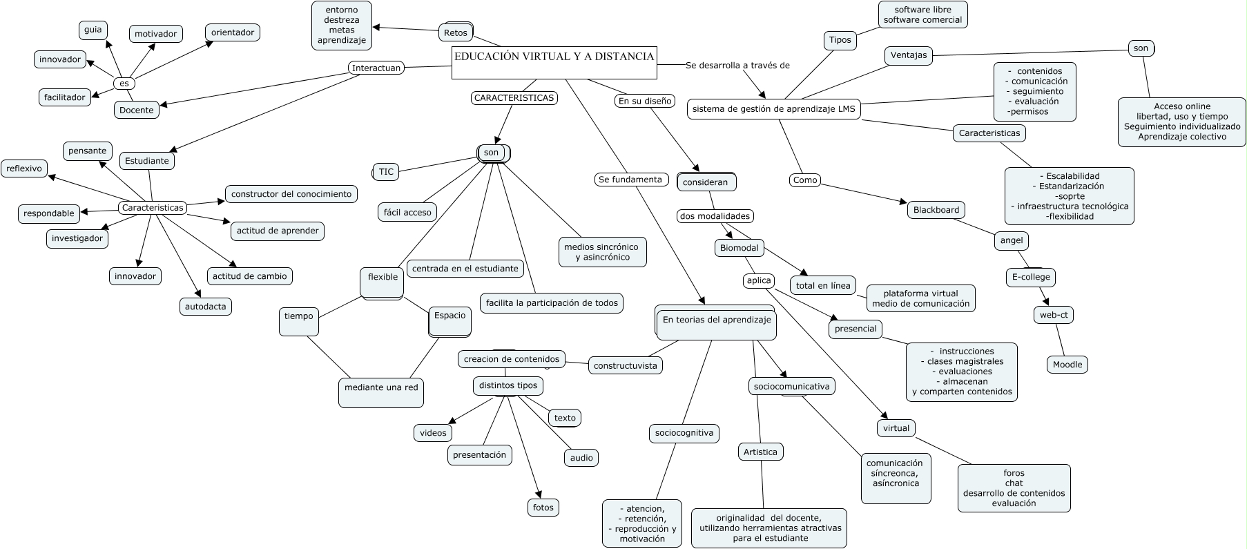 Este Cmap, tiene información relacionada con: ROSA CERVANTES, ???? ???? TIC, ???? ???? centrada en el estudiante, EDUCACIÓN VIRTUAL Y A DISTANCIA Se desarrolla a través de sistema de gestión de aprendizaje LMS, distintos tipos ???? audio, Biomodal aplica virtual, ???? ???? videos, ???? ???? medios sincrónico y asincrónico, Estudiante Caracteristicas investigador, Ventajas ???? son, En teorias del aprendizaje ???? - atencion, - retención, - reproducción y motivación, Docente es orientador, Docente es guia, artistica ???? originalidad del docente, utilizando herramientas atractivas para el estudiante, presencial ???? - instrucciones - clases magistrales - evaluaciones - almacenan y comparten contenidos, Espacio ???? ????, ???? ???? fotos, web-ct ???? Moodle, Estudiante Caracteristicas reflexivo, virtual ???? foros chat desarrollo de contenidos evaluación, constructuvista creacion de contenidos