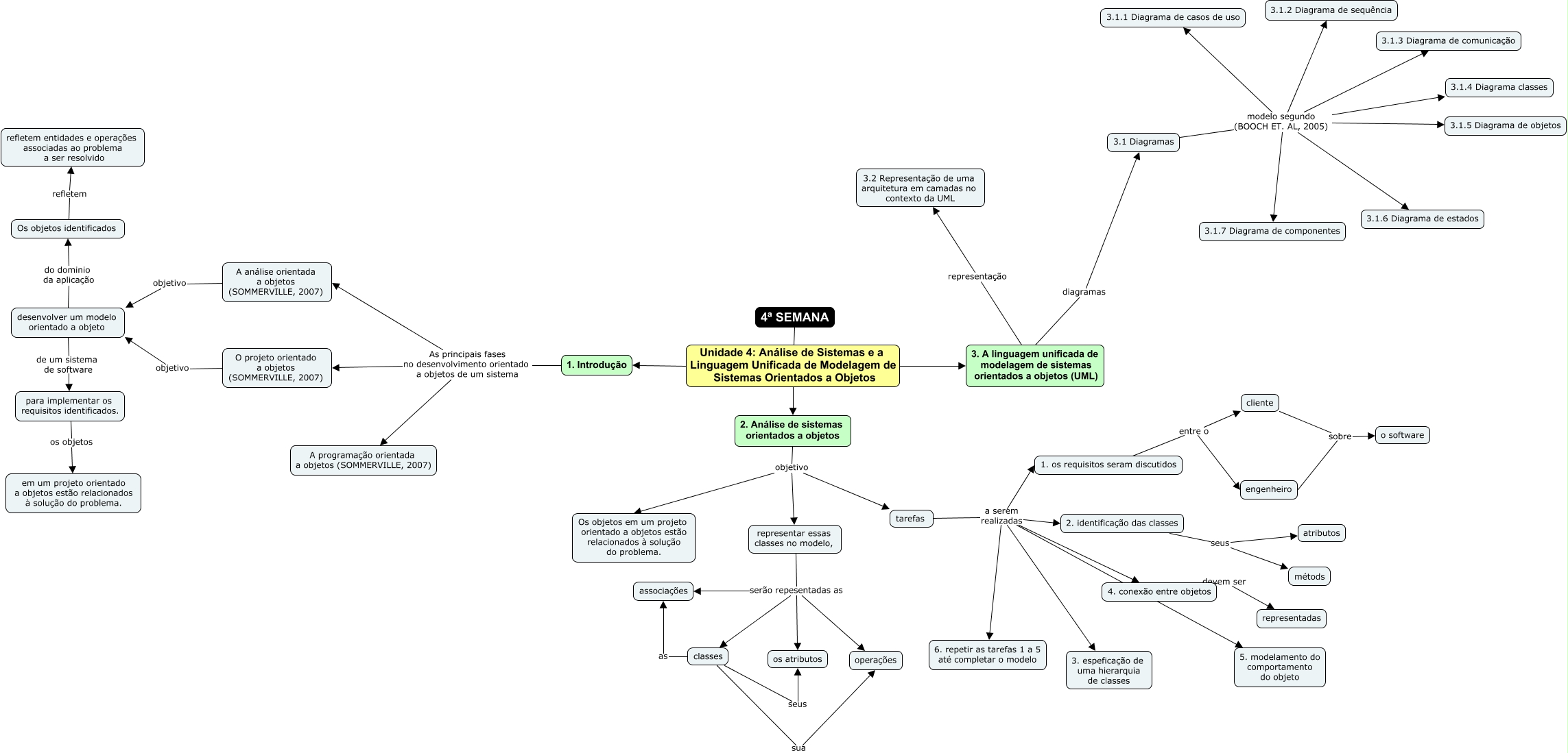 Esse mapa conceitual, produzido no IHMC CmapTools, tem a informação relacionada a: 4a semana, 4ª SEMANA Unidade 4: Análise de Sistemas e a Linguagem Unificada de Modelagem de Sistemas Orientados a Objetos 2. Análise de sistemas orientados a objetos, 1. Introdução As principais fases no desenvolvimento orientado a objetos de um sistema O projeto orientado a objetos (SOMMERVILLE, 2007), 4ª SEMANA Unidade 4: Análise de Sistemas e a Linguagem Unificada de Modelagem de Sistemas Orientados a Objetos 1. Introdução, 2. Análise de sistemas orientados a objetos objetivo Os objetos em um projeto orientado a objetos estão relacionados à solução do problema., 2. Análise de sistemas orientados a objetos objetivo representar essas classes no modelo,, representar essas classes no modelo, serão repesentadas as classes, 3. A linguagem unificada de modelagem de sistemas orientados a objetos (UML) representação 3.2 Representação de uma arquitetura em camadas no contexto da UML, engenheiro sobre o software, 4ª SEMANA Unidade 4: Análise de Sistemas e a Linguagem Unificada de Modelagem de Sistemas Orientados a Objetos 3. A linguagem unificada de modelagem de sistemas orientados a objetos (UML), Os objetos identificados refletem refletem entidades e operações associadas ao problema a ser resolvido, A análise orientada a objetos (SOMMERVILLE, 2007) objetivo desenvolver um modelo orientado a objeto, 3.1 Diagramas modelo segundo (BOOCH ET. AL, 2005) 3.1.5 Diagrama de objetos, 3.1 Diagramas modelo segundo (BOOCH ET. AL, 2005) 3.1.2 Diagrama de sequência, 1. Introdução As principais fases no desenvolvimento orientado a objetos de um sistema A análise orientada a objetos (SOMMERVILLE, 2007), desenvolver um modelo orientado a objeto de um sistema de software para implementar os requisitos identificados., 1. os requisitos seram discutidos entre o cliente, 3.1 Diagramas modelo segundo (BOOCH ET. AL, 2005) 3.1.7 Diagrama de componentes, representar essas classes no modelo, serão repesentadas as os atributos, classes sua operações, 3.1 Diagramas modelo segundo (BOOCH ET. AL, 2005) 3.1.4 Diagrama classes