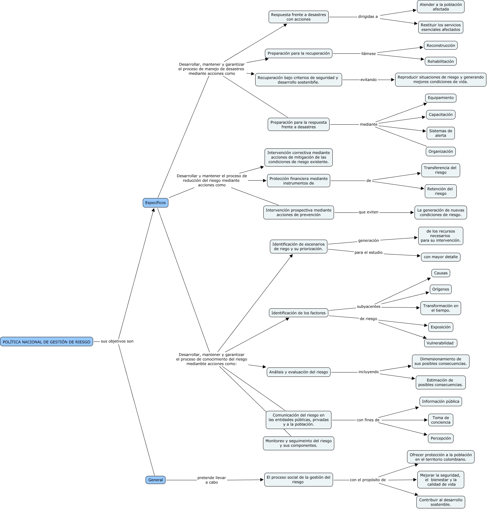 Esse mapa conceitual, produzido no IHMC CmapTools, tem a informação relacionada a: Política riesgo_1, Protección financiera mediante instrumentos de de Transferencia del riesgo, POLÍTICA NACIONAL DE GESTIÓN DE RIESGO sus objetivos son General, Análisis y evaluación del riesgo incluyendo Estimación de posibles consecuencias., Intervención prospectiva mediante acciones de prevención que eviten La generación de nuevas condiciones de riesgo., Específicos Desarrollar y mantener el proceso de reducción del riesgo mediante acciones como Intervención correctiva mediante acciones de mitigación de las condiciones de riesgo existente., Preparación para la respuesta frente a desastres mediante Sistemas de alerta, Respuesta frente a desastres con acciones dirigidas a Restituir los servicios esenciales afectados, Análisis y evaluación del riesgo incluyendo Dimensionamiento de sus posibles consecuencias., Comunicación del riesgo en las entidades públicas, privadas y a la población. con fines de Percepción, Preparación para la respuesta frente a desastres mediante Equipamiento, Específicos Desarrollar, mantener y garantizar el proceso de conocimiento del riesgo medianbte acciones como: Comunicación del riesgo en las entidades públicas, privadas y a la población., Específicos Desarrollar, mantener y garantizar el proceso de manejo de desastres mediante acciones como Preparación para la recuperación, Identificación de escenarios de riego y su priorización. generación de los recursos necesarios para su intervención., Comunicación del riesgo en las entidades públicas, privadas y a la población. con fines de Toma de conciencia, Específicos Desarrollar, mantener y garantizar el proceso de conocimiento del riesgo medianbte acciones como: Monitoreo y seguimeinto del riesgo y sus componentes., Específicos Desarrollar, mantener y garantizar el proceso de conocimiento del riesgo medianbte acciones como: Identificación de escenarios de riego y su priorización., Identificación de los factores subyacentes Orígenes, Preparación para la respuesta frente a desastres mediante Organización, Preparación para la recuperación llámese Reconstrucción, Específicos Desarrollar y mantener el proceso de reducción del riesgo mediante acciones como Intervención prospectiva mediante acciones de prevención