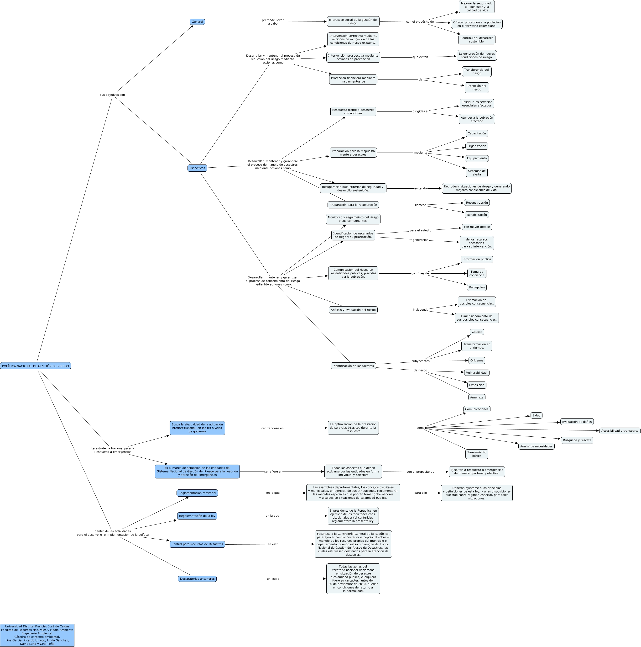 Esse mapa conceitual, produzido no IHMC CmapTools, tem a informação relacionada a: Política riesgo_2, POLÍTICA NACIONAL DE GESTIÓN DE RIESGO sus objetivos son General, Protección financiera mediante instrumentos de de Transferencia del riesgo, POLÍTICA NACIONAL DE GESTIÓN DE RIESGO dentro de las actividades para el desarrollo e implementación de la política Control para Recursos de Desastres, Análisis y evaluación del riesgo incluyendo Estimación de posibles consecuencias., Control para Recursos de Desastres en esta Facúltese a la Contraloría General de la República, para ejercer control posterior excepcional sobre el manejo de los recursos propios del municipio o departamento, cuando estso provengan del Fondo Nacional de Gestión del Riesgo de Desastres, los cuales estuviesen destinados para la atención de desastres., La optimización de la prestación de servicios b{asicos durante la respuesta como Salud, La optimización de la prestación de servicios b{asicos durante la respuesta como Comunicaciones, La optimización de la prestación de servicios b{asicos durante la respuesta como Evaluación de daños, La optimización de la prestación de servicios b{asicos durante la respuesta como Saneamiento básico, Intervención prospectiva mediante acciones de prevención que eviten La generación de nuevas condiciones de riesgo., Específicos Desarrollar y mantener el proceso de reducción del riesgo mediante acciones como Intervención correctiva mediante acciones de mitigación de las condiciones de riesgo existente., Respuesta frente a desastres con acciones dirigidas a Restituir los servicios esenciales afectados, Preparación para la respuesta frente a desastres mediante Sistemas de alerta, Análisis y evaluación del riesgo incluyendo Dimensionamiento de sus posibles consecuencias., Preparación para la respuesta frente a desastres mediante Equipamiento, Comunicación del riesgo en las entidades públicas, privadas y a la población. con fines de Percepción, Es el marco de actuación de las entidades del Sistema Nacional de Gestión del Riesgo para la reacción y atención de emergencias se refiere a Todos los aspectos que deben activarse por las entidades en forma individual y colectiva, Específicos Desarrollar, mantener y garantizar el proceso de conocimiento del riesgo medianbte acciones como: Comunicación del riesgo en las entidades públicas, privadas y a la población., Identificación de escenarios de riego y su priorización. generación de los recursos necesarios para su intervención., Específicos Desarrollar, mantener y garantizar el proceso de manejo de desastres mediante acciones como Preparación para la recuperación