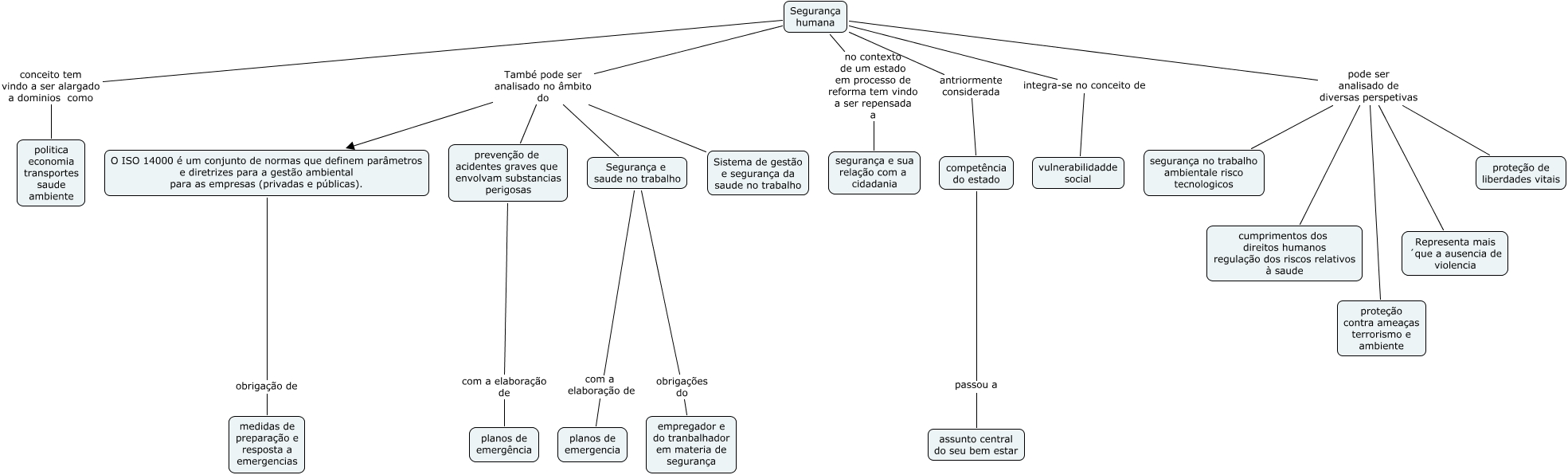 Esse mapa conceitual, produzido no IHMC CmapTools, tem a informação relacionada a: Segur nas Organiz e prot civil, prevenção de acidentes graves que envolvam substancias perigosas com a elaboração de planos de emergência, Segurança humana no contexto de um estado em processo de reforma tem vindo a ser repensada a segurança e sua relação com a cidadania, Segurança humana antriormente considerada competência do estado, competência do estado passou a assunto central do seu bem estar, Segurança humana També pode ser analisado no âmbito do O ISO 14000 é um conjunto de normas que definem parâmetros e diretrizes para a gestão ambiental para as empresas (privadas e públicas)., Segurança humana També pode ser analisado no âmbito do Segurança e saude no trabalho, Segurança humana pode ser analisado de diversas perspetivas proteção contra ameaças terrorismo e ambiente, Segurança e saude no trabalho com a elaboração de planos de emergencia, O ISO 14000 é um conjunto de normas que definem parâmetros e diretrizes para a gestão ambiental para as empresas (privadas e públicas). obrigação de medidas de preparação e resposta a emergencias, Segurança humana pode ser analisado de diversas perspetivas proteção de liberdades vitais, Segurança humana pode ser analisado de diversas perspetivas Representa mais ´que a ausencia de violencia, Segurança humana conceito tem vindo a ser alargado a dominios como politica economia transportes saude ambiente, Segurança humana pode ser analisado de diversas perspetivas segurança no trabalho ambientale risco tecnologicos, Segurança humana integra-se no conceito de vulnerabilidadde social, Segurança humana pode ser analisado de diversas perspetivas cumprimentos dos direitos humanos regulação dos riscos relativos à saude, Segurança e saude no trabalho obrigações do empregador e do tranbalhador em materia de segurança, Segurança humana També pode ser analisado no âmbito do Sistema de gestão e segurança da saude no trabalho, Segurança humana També pode ser analisado no âmbito do prevenção de acidentes graves que envolvam substancias perigosas