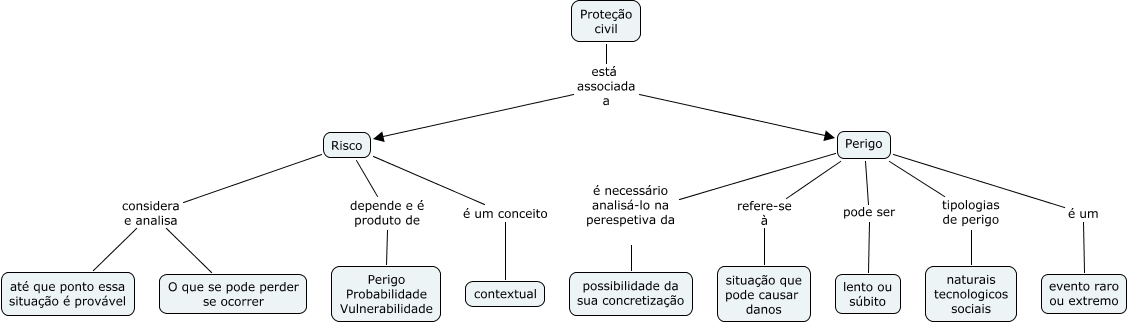 Esse mapa conceitual, produzido no IHMC CmapTools, tem a informação relacionada a: Risco versus desastre, Perigo é um evento raro ou extremo, Proteção civil está associada a Risco, Proteção civil está associada a Perigo, Risco é um conceito contextual, Perigo pode ser lento ou súbito, Perigo tipologias de perigo naturais tecnologicos sociais, Perigo é necessário analisá-lo na perespetiva da possibilidade da sua concretização, Perigo refere-se à situação que pode causar danos, Risco considera e analisa O que se pode perder se ocorrer, Risco considera e analisa até que ponto essa situação é provável, Risco depende e é produto de Perigo Probabilidade Vulnerabilidade