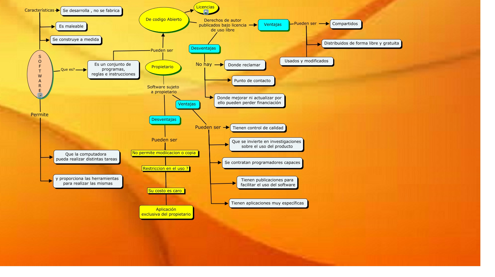 Este Cmap, tiene información relacionada con: software, Ventajas Pueden ser Distribuidos de forma libre y gratuita, Desventajas No hay Punto de contacto, Desventajas Pueden ser Aplicación exclusiva del propietario, Es un conjunto de programas, reglas e instrucciones Pueden ser Propietario, Ventajas Pueden ser Se contratan programadores capaces, S O F T W A R E Que es? Es un conjunto de programas, reglas e instrucciones, Ventajas Pueden ser Compartidos, Propietario Software sujeto a propietario Ventajas, S O F T W A R E Permite y proporciona las herramientas para realizar las mismas, Ventajas Pueden ser Tienen aplicaciones muy específicas, Desventajas No hay Donde mejorar ni actualizar por ello pueden perder financiación, Es un conjunto de programas, reglas e instrucciones Pueden ser De codigo Abierto, S O F T W A R E Características Es maleable, Desventajas Pueden ser No permite modiicacion o copia, Ventajas Pueden ser Que se invierte en investigaciones sobre el uso del producto, S O F T W A R E Características Se construye a medida, S O F T W A R E Características Se desarrolla , no se fabrica, Ventajas Pueden ser Tienen publicaciones para facilitar el uso del software, Desventajas No hay Donde reclamar, De codigo Abierto Derechos de autor publicados bajo licencia de uso libre Ventajas