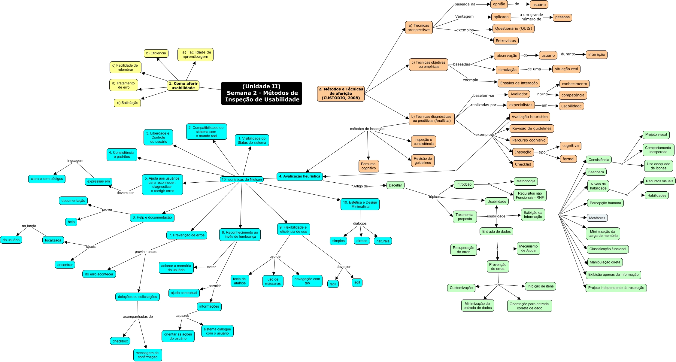 Esse mapa conceitual, produzido no IHMC CmapTools, tem a informação relacionada a: 2a semana, 8. Reconhecimento ao invés de lembrança permitir ajuda contextual, Entrada de dados x Recuperação de erros, Prevenção de erros x Orientação para entrada correta de dado, 4. Avalicação heurística 10 heuristicas de Nielsen 7. Prevenção de erros, 4. Avalicação heurística 10 heuristicas de Nielsen 5. Ajuda aos usuários para reconhecer, diagnosticar e corrigir erros, 6. Help e documentação fáceis focalizada, 9. Flexibilidade e eficiência de uso uso de uso de máscaras, 6. Help e documentação fáceis encontrar, b) Técnicas diagnósticas ou preditivas (Analítica) exemplo Percurso cognitivo, (Unidade II) Semana 2 - Métodos de Inspeção de Usabilidade 1. Como aferir usabilidade c) Facilidade de relembrar, (Unidade II) Semana 2 - Métodos de Inspeção de Usabilidade 2. Métodos e Técnicas de aferição (CUSTÓDIO, 2008) c) Técnicas objetivas ou empíricas, (Unidade II) Semana 2 - Métodos de Inspeção de Usabilidade 1. Como aferir usabilidade d) Tratamento de erro, 4. Avalicação heurística 10 heuristicas de Nielsen 2. Compatibilidade do sistema com o mundo real, usuário durante interação, Níveis de habilidade x Habilidades, Taxonomia proposta usubilidade Entrada de dados, 6. Help e documentação prover documentação, (Unidade II) Semana 2 - Métodos de Inspeção de Usabilidade 1. Como aferir usabilidade e) Satisfação, simulação de uma situação real, deleções ou solicitações acompanhadas de mensagem de confirmação