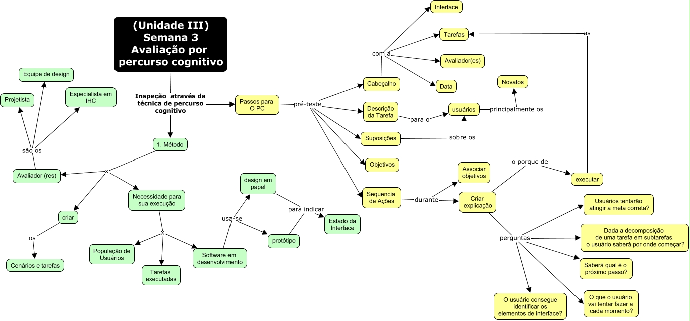 Esse mapa conceitual, produzido no IHMC CmapTools, tem a informação relacionada a: 3a semana, Avaliador (res) são os Equipe de design, Passos para O PC pré-teste Objetivos, Avaliador (res) são os Projetista, Sequencia de Ações durante Criar explicação, Cabeçalho com a Data, Criar explicação perguntas Usuários tentarão atingir a meta correta?, Passos para O PC pré-teste Sequencia de Ações, Sequencia de Ações durante Associar objetivos, Cabeçalho com a Tarefas, 1. Método x Necessidade para sua execução, Necessidade para sua execução x Software em desenvolvimento, Criar explicação perguntas O que o usuário vai tentar fazer a cada momento?, Avaliador (res) são os Especialista em IHC, Passos para O PC pré-teste Descrição da Tarefa, Passos para O PC pré-teste Cabeçalho, executar as Tarefas, 1. Método x Avaliador (res), usuários principalmente os Novatos, design em papel para indicar Estado da Interface, Cabeçalho com a Avaliador(es)