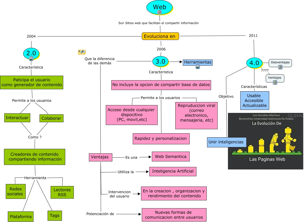 This Concept Map, created with IHMC CmapTools, has information related to: web 2.0-3.0-4.0, Web Son Sitios web que facilitan el compartir información Evoluciona en, No incluye la opcion de compartir base de datos Permite a los usuarios Rapidez y personalizacion, Ventajas Es una Web Semantica, 4.0 ???? Ventajas, Paticipa el usuario como generador de contenido Permite a los usuarios Colaborar, Evoluciona en 2006 3.0, Evoluciona en 2004 2.0, Ventajas Intervencion del usuario En la creacion , organizacion y rendimiento del contenido, Ventajas Utliliza la Inteligencia Artificial, 4.0 ???? Desventajas, Creadores de contenido compartiendo información Herramienta Lectores RSS, 3.0 ???? Herramientas, 2.0 Característica Paticipa el usuario como generador de contenido, Paticipa el usuario como generador de contenido Permite a los usuarios ????, Ventajas Potenciación de Nuevas formas de comunicacion entre usuarios, Creadores de contenido compartiendo información Herramienta Tags, Interactuar Como ? Creadores de contenido compartiendo información, No incluye la opcion de compartir base de datos Permite a los usuarios Acceso desde cualquier dispocitivo (PC, movil,etc), 4.0 Objetivo Unir inteligencias, 4.0 Características Usable Accesible Actualizable