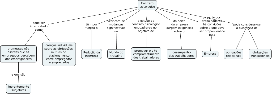 Esse mapa conceitual, produzido no IHMC CmapTools, tem a informação relacionada a: contrato_psicologico, Contrato psicologico pode ser interpretado como crenças individuais sobre as obrigações mutuas no relacionamento entre empregador e empregados, Contrato psicologico têm por função a Redução da incerteza, Contrato psicologico da parte dos trabalhadores há convições sobre o que deve ser proporcionado pela Empresa, Contrato psicologico verificam-se mudanças significativas no Mundo do trabalho, promessas não escritas que os empregados percebem dos empregadores e que são inerentemente subjetivas, Contrato psicologico pode considerar-se a existência de obrigações relacionais, Contrato psicologico o estudo do contrato psicológico enquadra-se no objetivo de promover o alto comprometimento dos trabalhadores, Contrato psicologico pode considerar-se a existência de obrigações transacionais, Contrato psicologico da parte da empresa surgem exigências sobre o desempenho dos trabalhadores, Contrato psicologico pode ser interpretado como promessas não escritas que os empregados percebem dos empregadores