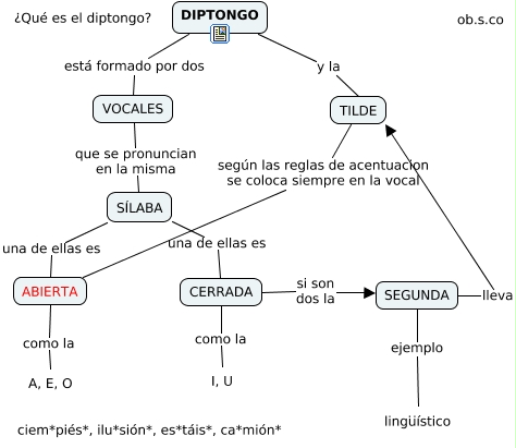This Concept Map, created with IHMC CmapTools, has information related to: diptongo, ABIERTA como la A, E, O, DIPTONGO está formado por dos VOCALES, TILDE según las reglas de acentuacion se coloca siempre en la vocal ABIERTA, SÍLABA una de ellas es CERRADA, VOCALES que se pronuncian en la misma SÍLABA, SEGUNDA lleva TILDE, CERRADA como la I, U, CERRADA si son dos la SEGUNDA, SEGUNDA ejemplo lingüístico, DIPTONGO y la TILDE, SÍLABA una de ellas es ABIERTA