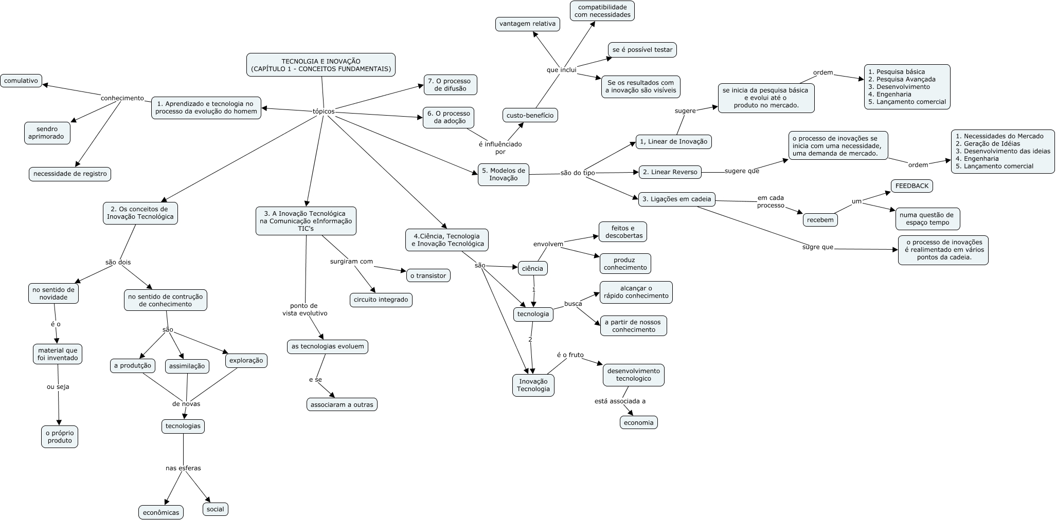 Esse mapa conceitual, produzido no IHMC CmapTools, tem a informação relacionada a: 1a.semana, 3. A Inovação Tecnológica na Comunicação e Informação TIC's surgiram com o transistor, custo-benefício que inclui vantagem relativa, recebem um FEEDBACK, a produtção de novas tecnologias, TECNOLGIA E INOVAÇÃO (CAPÍTULO 1 - CONCEITOS FUNDAMENTAIS) tópicos 2. Os conceitos de Inovação Tecnológica, ciência envolvem feitos e descobertas, tecnologia busca alcançar o rápido conhecimento, custo-benefício que inclui se é possível testar, desenvolvimento tecnologico está associada a economia, 2. Os conceitos de Inovação Tecnológica são dois no sentido de contrução de conhecimento, 3. A Inovação Tecnológica na Comunicação e Informação TIC's ponto de vista evolutivo as tecnologias evoluem, tecnologia 2 Inovação Tecnologia, tecnologias nas esferas social, recebem um numa questão de espaço tempo, TECNOLGIA E INOVAÇÃO (CAPÍTULO 1 - CONCEITOS FUNDAMENTAIS) tópicos 4.Ciência, Tecnologia e Inovação Tecnológica, se inicia da pesquisa básica e evolui até o produto no mercado. ordem 1. Pesquisa básica 2. Pesquisa Avançada 3. Desenvolvimento 4. Engenharia 5. Lançamento comercial, 3. Ligações em cadeia em cada processo recebem, custo-benefício que inclui Se os resultados com a inovação são visíveis, tecnologia busca a partir de nossos conhecimento, ciência 1 tecnologia