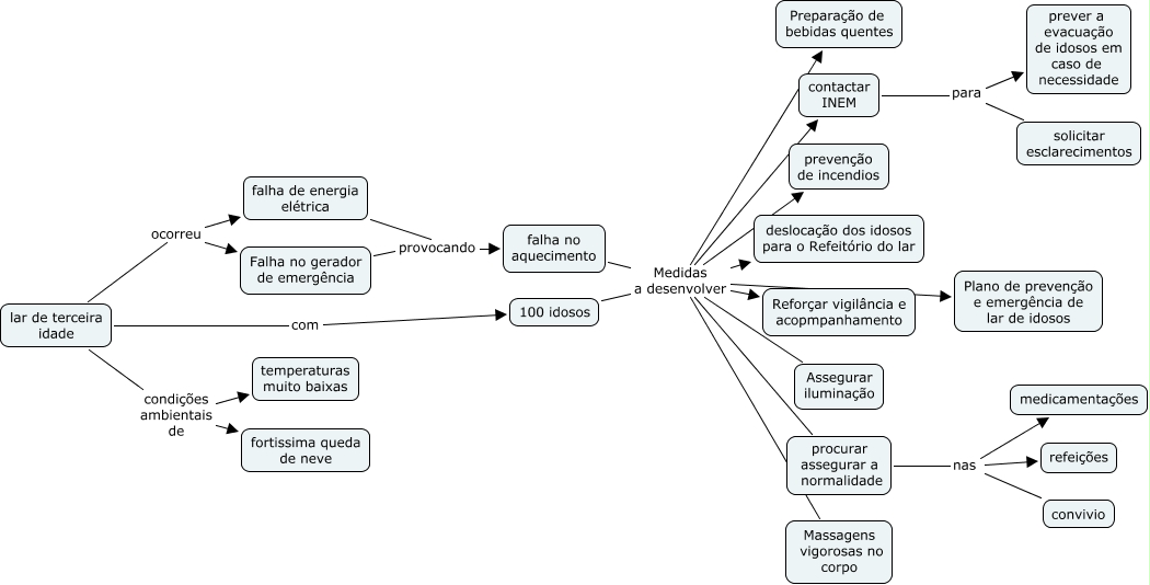 Esse mapa conceitual, produzido no IHMC CmapTools, tem a informação relacionada a: problemas_2, 100 idosos Medidas a desenvolver Plano de prevenção e emergência de lar de idosos, lar de terceira idade com 100 idosos, 100 idosos Medidas a desenvolver prevenção de incendios, procurar assegurar a normalidade nas refeições, falha no aquecimento Medidas a desenvolver Plano de prevenção e emergência de lar de idosos, contactar INEM para prever a evacuação de idosos em caso de necessidade, falha de energia elétrica provocando falha no aquecimento, 100 idosos Medidas a desenvolver deslocação dos idosos para o Refeitório do lar, 100 idosos Medidas a desenvolver contactar INEM, procurar assegurar a normalidade nas medicamentações, procurar assegurar a normalidade nas convivio, Falha no gerador de emergência provocando falha no aquecimento, contactar INEM para solicitar esclarecimentos, falha no aquecimento Medidas a desenvolver Assegurar iluminação, 100 idosos Medidas a desenvolver Preparação de bebidas quentes, falha no aquecimento Medidas a desenvolver prevenção de incendios, 100 idosos Medidas a desenvolver Reforçar vigilância e acopmpanhamento, falha no aquecimento Medidas a desenvolver Reforçar vigilância e acopmpanhamento, falha no aquecimento Medidas a desenvolver procurar assegurar a normalidade, falha no aquecimento Medidas a desenvolver Massagens vigorosas no corpo