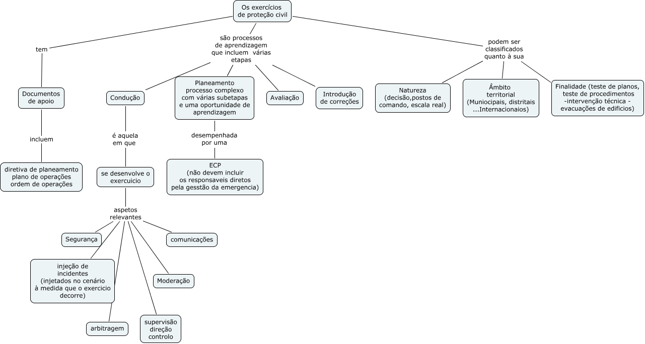 Esse mapa conceitual, produzido no IHMC CmapTools, tem a informação relacionada a: exerc_3, Os exercícios de proteção civil são processos de aprendizagem que incluem várias etapas Condução, se desenvolve o exercuicio aspetos relevantes Segurança, Condução é aquela em que se desenvolve o exercuicio, se desenvolve o exercuicio aspetos relevantes arbitragem, Os exercícios de proteção civil podem ser classificados quanto à sua Finalidade (teste de planos, teste de procedimentos -intervenção técnica - evacuações de edificios), Documentos de apoio incluem diretiva de planeamento plano de operações ordem de operações, Os exercícios de proteção civil tem Documentos de apoio, Os exercícios de proteção civil são processos de aprendizagem que incluem várias etapas Planeamento processo complexo com várias subetapas e uma oportunidade de aprendizagem, Os exercícios de proteção civil são processos de aprendizagem que incluem várias etapas Introdução de correções, Os exercícios de proteção civil podem ser classificados quanto à sua Âmbito territorial (Muniocipais, distritais ...Internacionaios), Planeamento processo complexo com várias subetapas e uma oportunidade de aprendizagem desempenhada por uma ECP (não devem incluir os responsaveis diretos pela gesstão da emergencia), se desenvolve o exercuicio aspetos relevantes injeção de incidentes (injetados no cenário à medida que o exercicio decorre), Os exercícios de proteção civil podem ser classificados quanto à sua Natureza (decisão,postos de comando, escala real), Os exercícios de proteção civil são processos de aprendizagem que incluem várias etapas Avaliação, se desenvolve o exercuicio aspetos relevantes supervisão direção controlo, se desenvolve o exercuicio aspetos relevantes comunicações, se desenvolve o exercuicio aspetos relevantes Moderação
