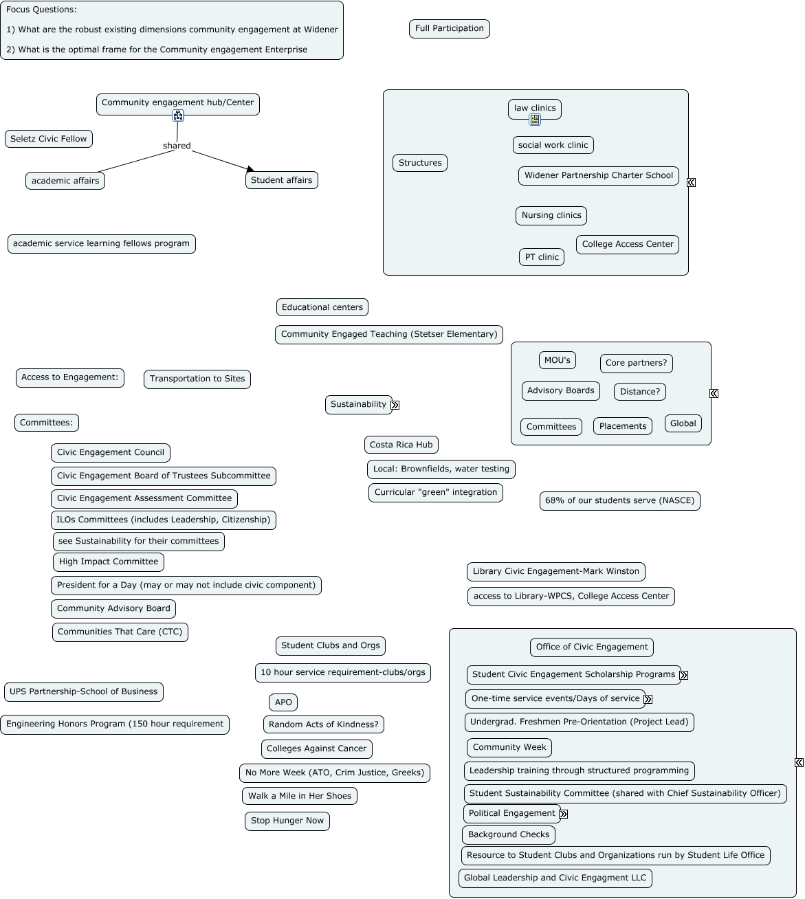 This Concept Map, created with IHMC CmapTools, has information related to: CommunityEngagementCenter_Widener_v1, Community engagement hub/Center shared Student affairs, academic affairs shared Student affairs