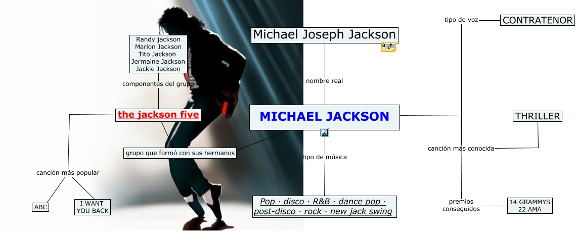 Este Cmap, tiene información relacionada con: MICHAEL JACKSON.cmap, MICHAEL JACKSON premios conseguidos 14 GRAMMYS 22 AMA, the jackson five canción más popular I WANT YOU BACK, MICHAEL JACKSON tipo de voz CONTRATENOR, the jackson five canción más popular ABC, MICHAEL JACKSON ???? grupo que formó con sus hermanos, MICHAEL JACKSON tipo de música Pop · disco · R&B · dance pop · post-disco · rock · new jack swing, the jackson five componentes del grupo Randy jackson Marlon Jackson Tito Jackson Jermaine Jackson Jackie Jackson, the jackson five ???? grupo que formó con sus hermanos, ???? canción más conocida THRILLER, MICHAEL JACKSON nombre real Michael Joseph Jackson