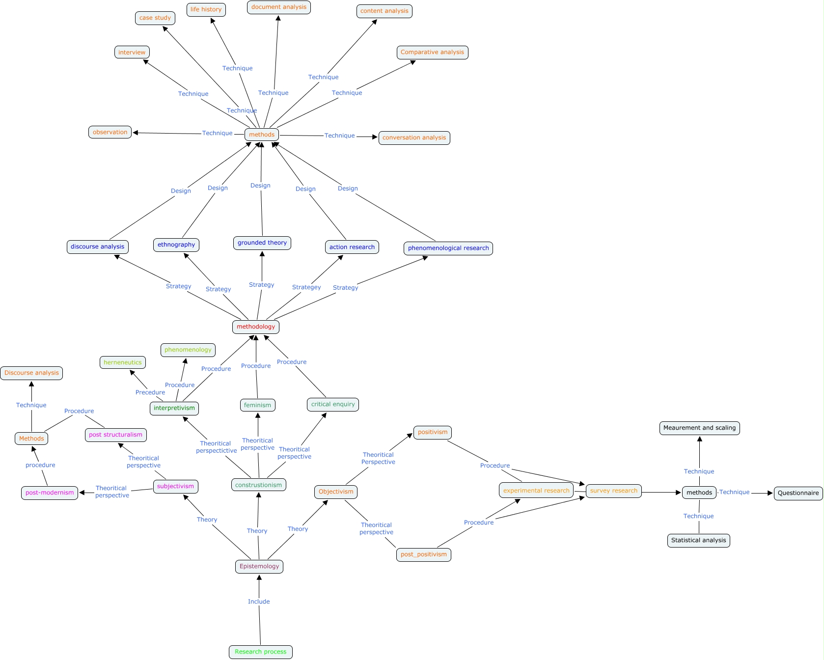 This Concept Map, created with IHMC CmapTools, has information related to: research process, construstionism Theoritical perspectictive interpretivism, methods Technique Comparative analysis, post_positivism Procedure survey research, methodology Strategy phenomenological research, methodology Strategy grounded theory, experimental research ???? methods, methods Technique conversation analysis, construstionism Theoritical perspective critical enquiry, construstionism Theoritical perspective feminism, subjectivism Theoritical perspective post-modernism, Research process Include Epistemology, Objectivism Theoritical perspective post_positivism, methods Technique case study, positivism Procedure survey research, methods Technique life history, Methods Technique Discourse analysis, feminism Procedure methodology, subjectivism Theoritical perspective post structuralism, post structuralism Procedure Methods, positivism Procedure experimental research