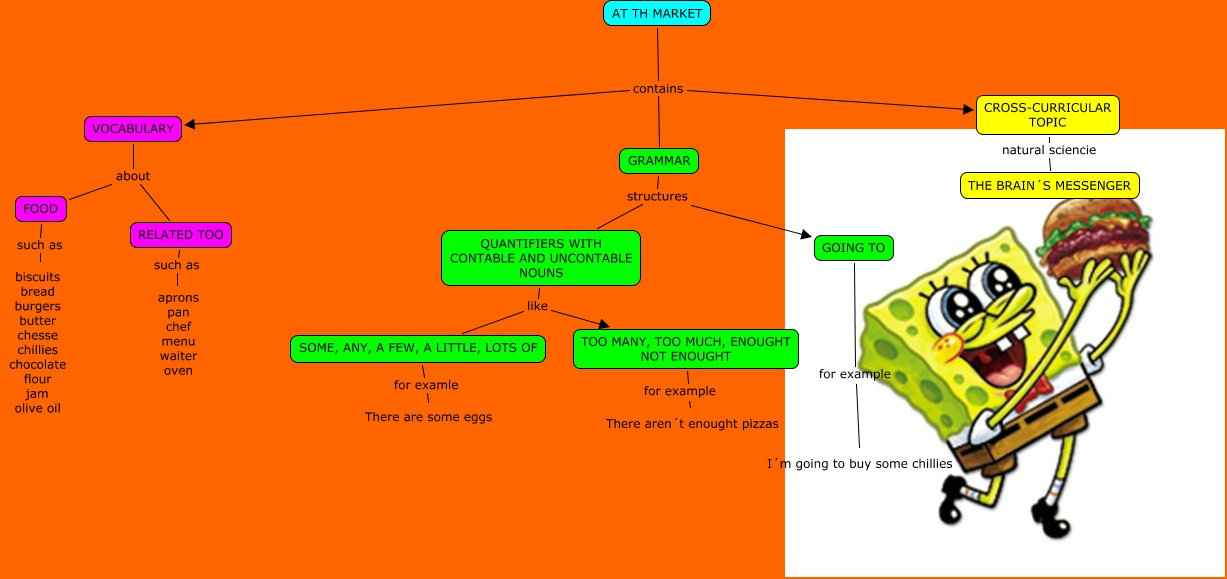 Este Cmap, tiene información relacionada con: AT THE MARKET- Miguel F, VOCABULARY about FOOD, RELATED TOO such as aprons pan chef menu waiter oven, FOOD such as biscuits bread burgers butter chesse chillies chocolate flour jam olive oil, QUANTIFIERS WITH CONTABLE AND UNCONTABLE NOUNS like SOME, ANY, A FEW, A LITTLE, LOTS OF, GRAMMAR structures GOING TO, QUANTIFIERS WITH CONTABLE AND UNCONTABLE NOUNS like TOO MANY, TOO MUCH, ENOUGHT NOT ENOUGHT, AT TH MARKET contains GRAMMAR, SOME, ANY, A FEW, A LITTLE, LOTS OF for examle There are some eggs, AT TH MARKET contains VOCABULARY, GOING TO for example I´m going to buy some chillies, AT TH MARKET contains CROSS-CURRICULAR TOPIC, VOCABULARY about RELATED TOO, CROSS-CURRICULAR TOPIC natural sciencie THE BRAIN´S MESSENGER, GRAMMAR structures QUANTIFIERS WITH CONTABLE AND UNCONTABLE NOUNS, TOO MANY, TOO MUCH, ENOUGHT NOT ENOUGHT for example There aren´t enought pizzas