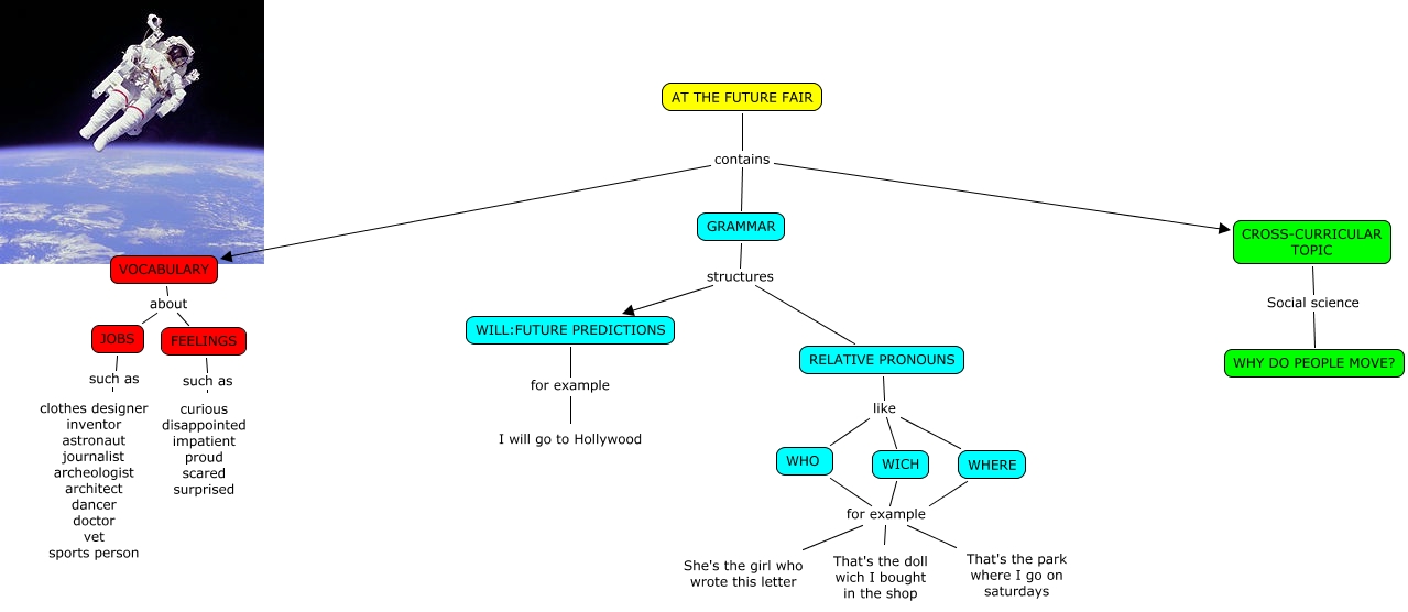 Este Cmap, tiene información relacionada con: AT THE FUTURE FAIR-Lucía F, AT THE FUTURE FAIR contains GRAMMAR, WHO for example That's the doll wich I bought in the shop, GRAMMAR structures RELATIVE PRONOUNS, WILL:FUTURE PREDICTIONS for example I will go to Hollywood, RELATIVE PRONOUNS like WHO, VOCABULARY about FEELINGS, WHO for example That's the park where I go on saturdays, WHERE for example She's the girl who wrote this letter, CROSS-CURRICULAR TOPIC Social science WHY DO PEOPLE MOVE?, WHERE for example That's the doll wich I bought in the shop, JOBS such as clothes designer inventor astronaut journalist archeologist architect dancer doctor vet sports person, WHO for example She's the girl who wrote this letter, WICH for example That's the doll wich I bought in the shop, AT THE FUTURE FAIR contains CROSS-CURRICULAR TOPIC, RELATIVE PRONOUNS like WHERE, AT THE FUTURE FAIR contains VOCABULARY, VOCABULARY about JOBS, WICH for example She's the girl who wrote this letter, WICH for example That's the park where I go on saturdays, WHERE for example That's the park where I go on saturdays